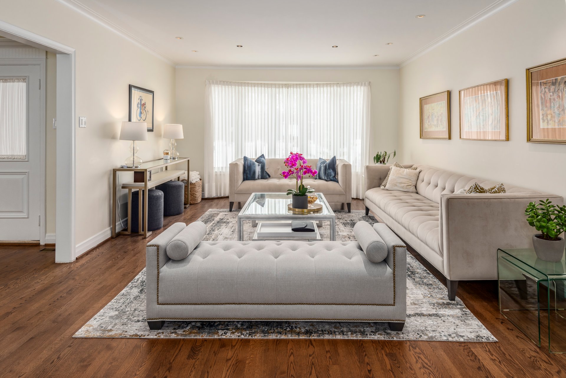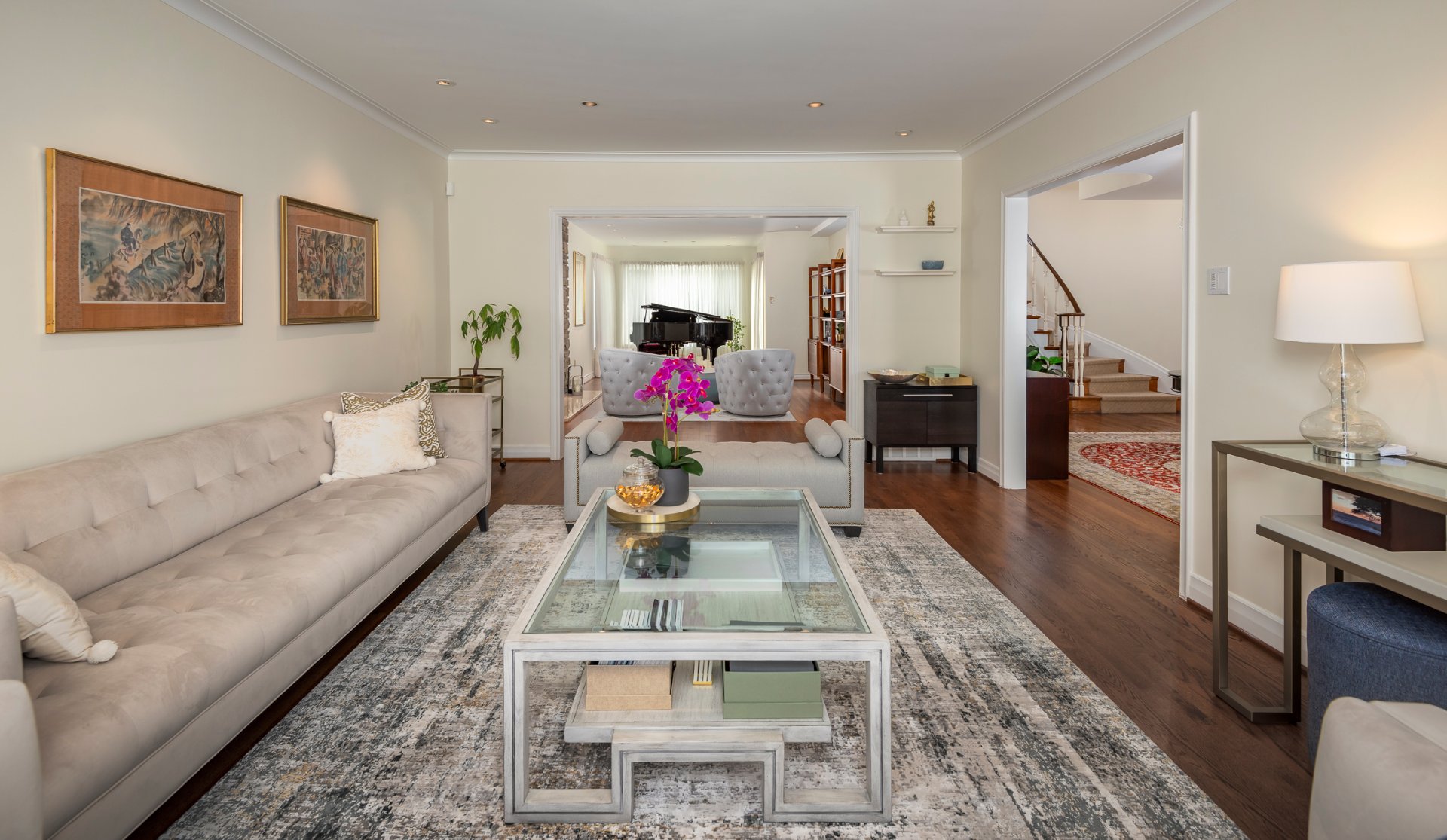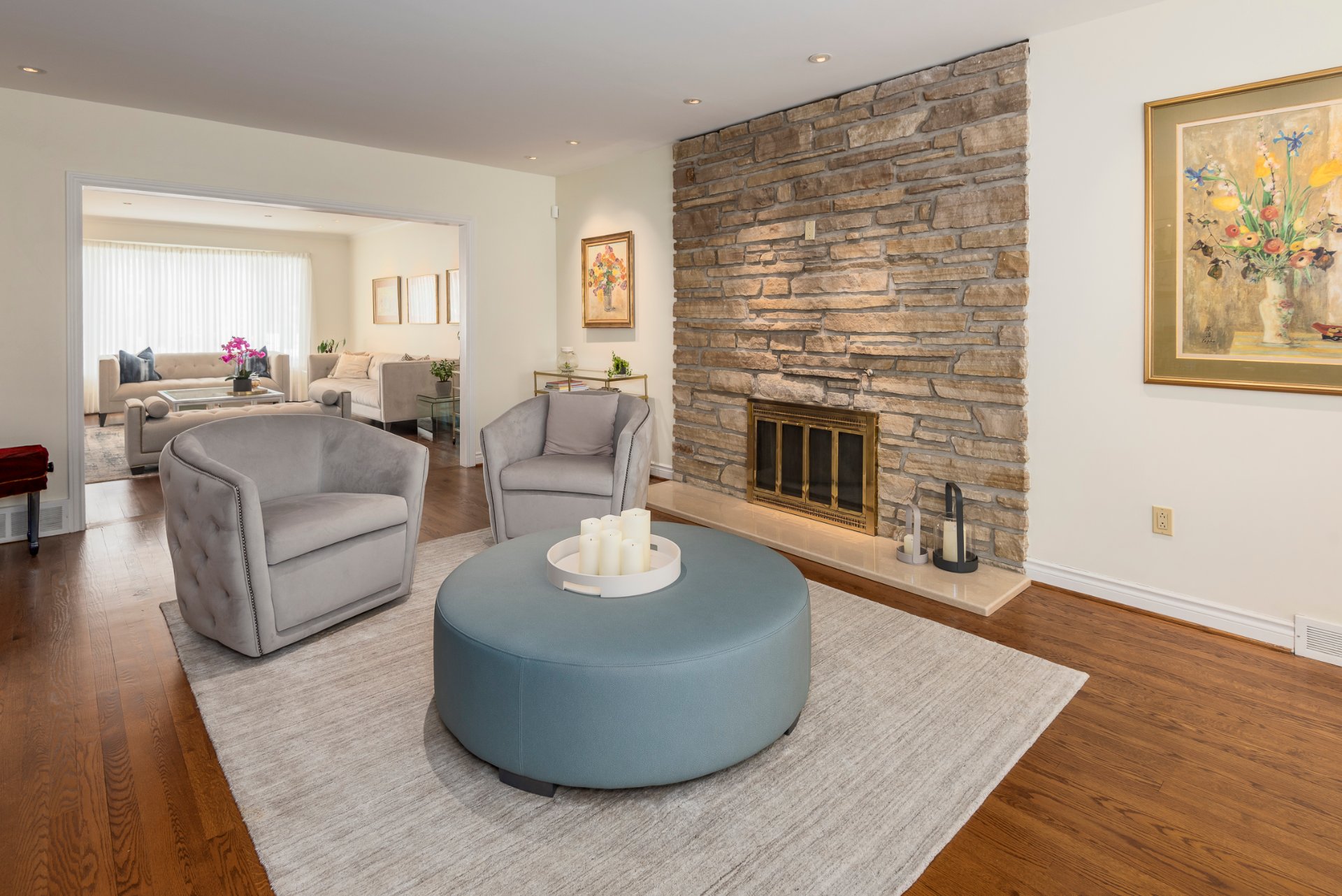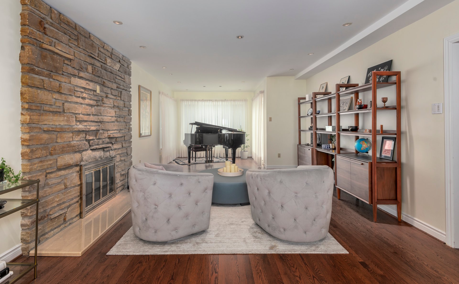 + Impressive double living room spanning the full depth of the home, featuring a stone mantel fireplace and offering multiple sitting areas, including space for a piano