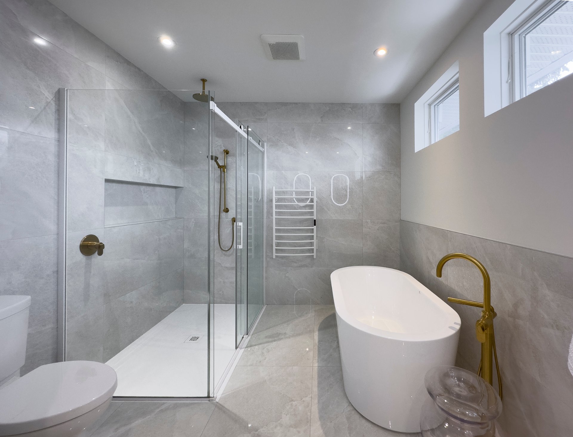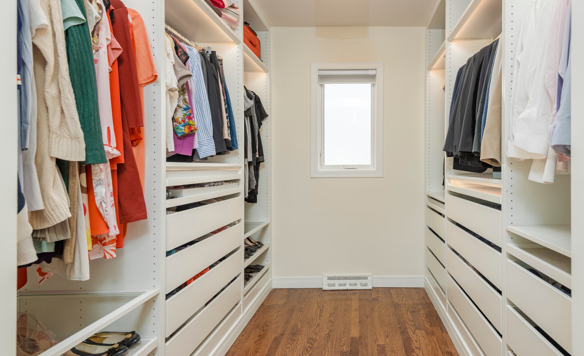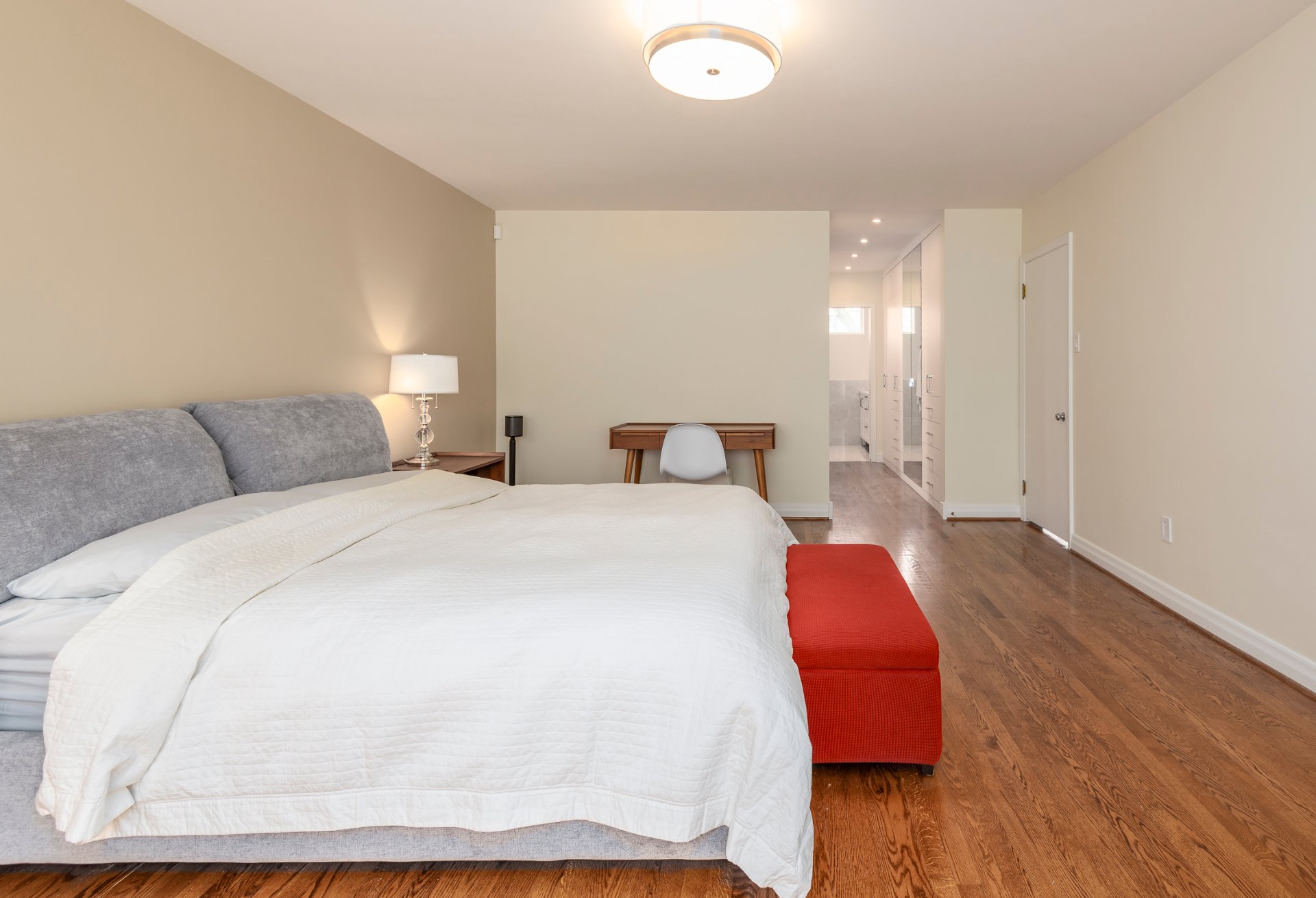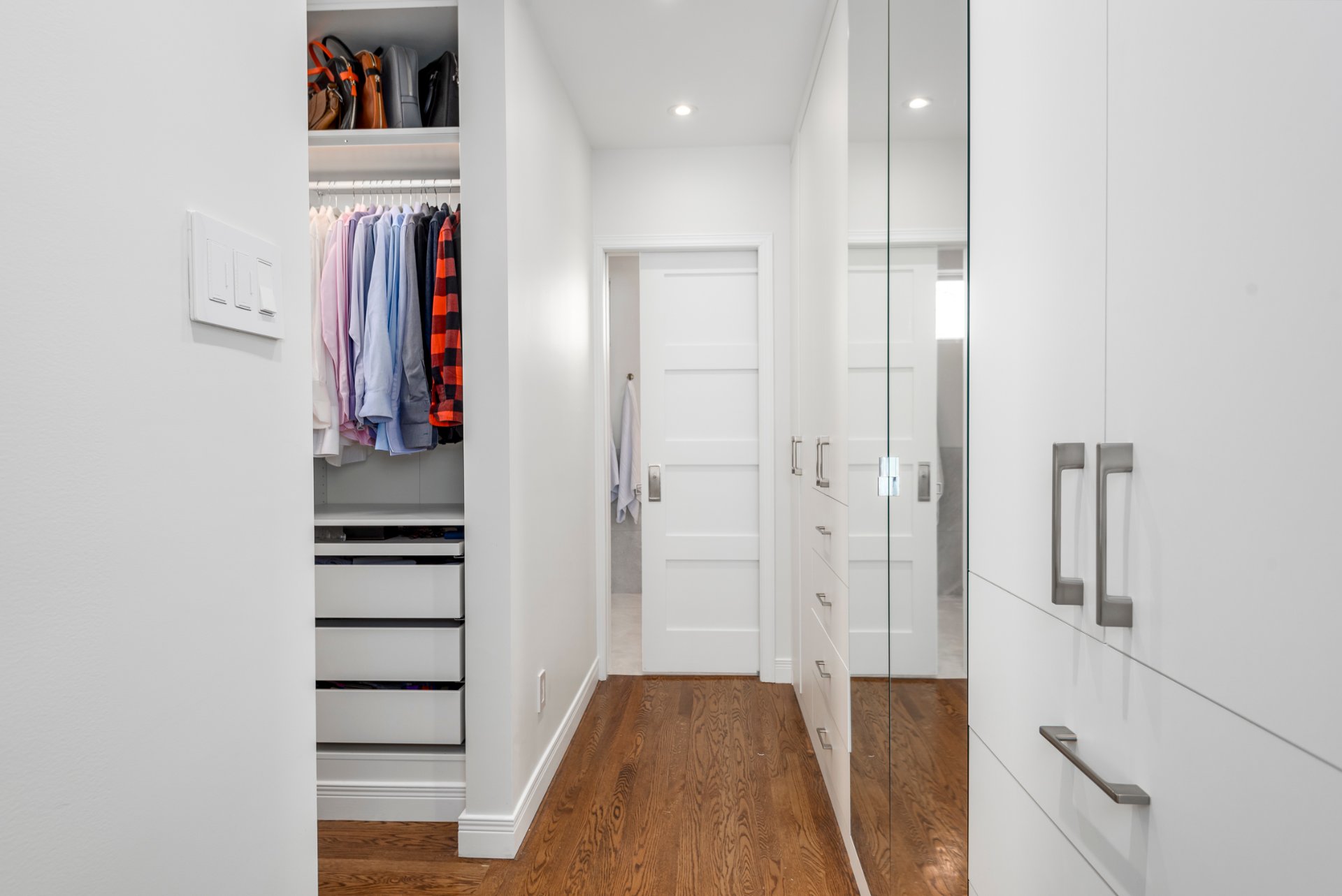 + Expansive primary suite featuring a custom walk-in closet, renovated ensuite bathroom with heated floors, double vanity, bathtub, and separate shower