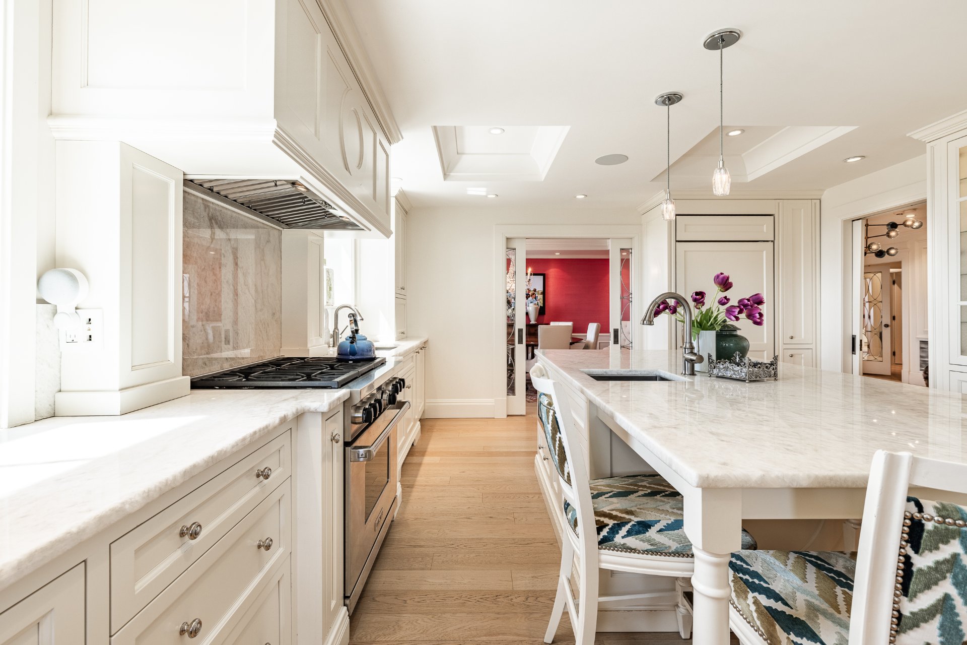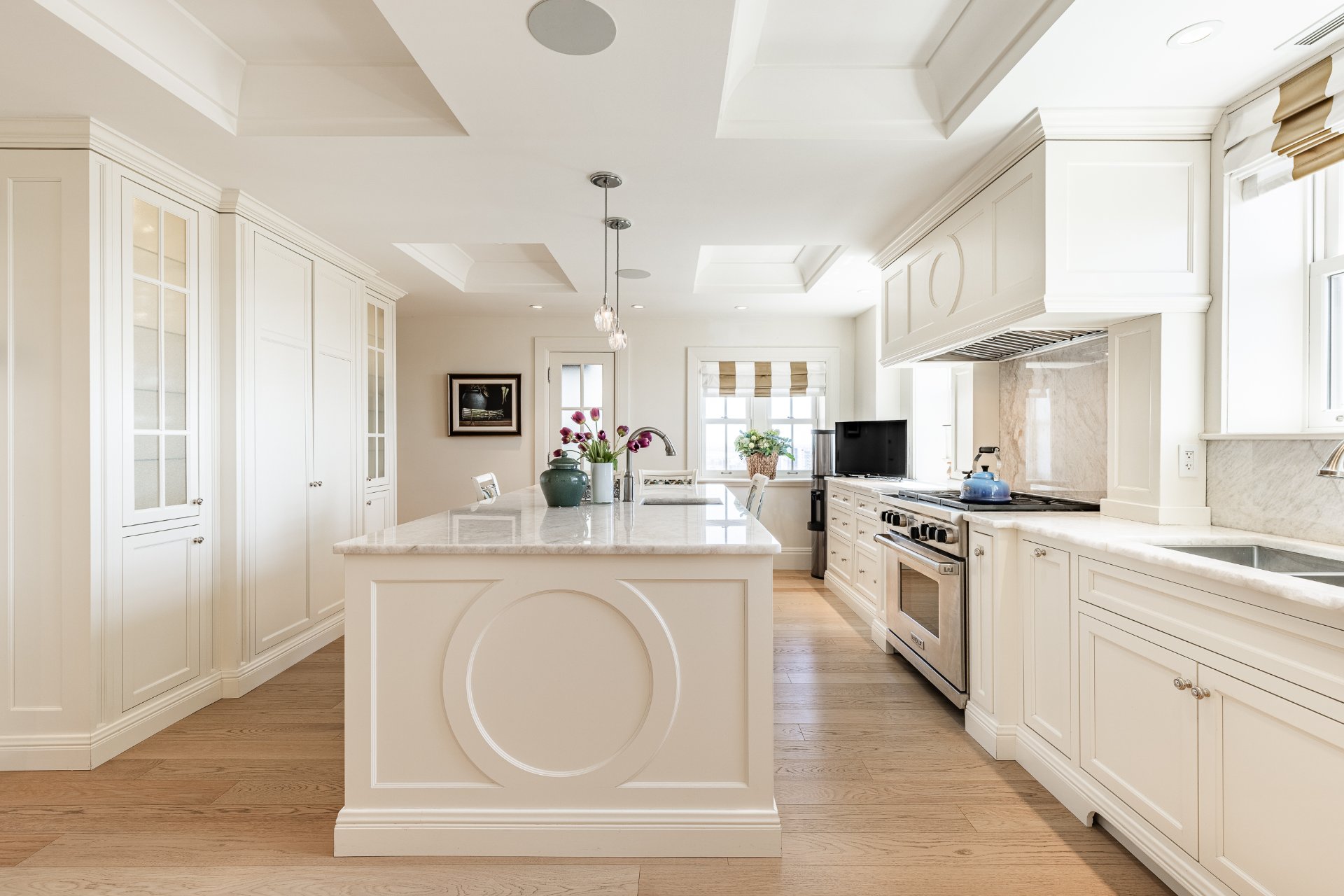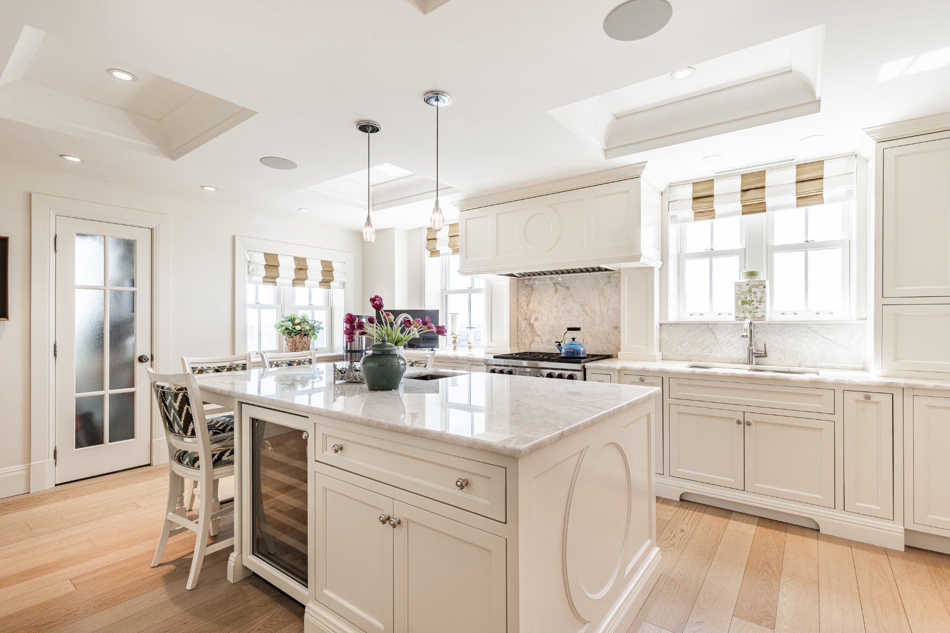 + Gourmet kitchen with oversized island, marble countertops, custom cabinetry, and top-tier appliances