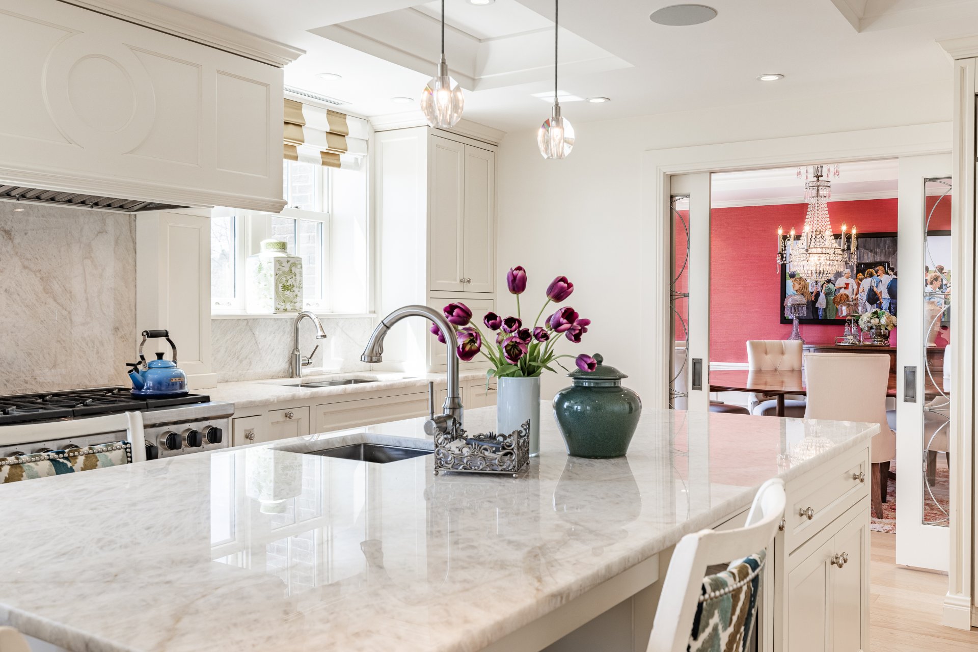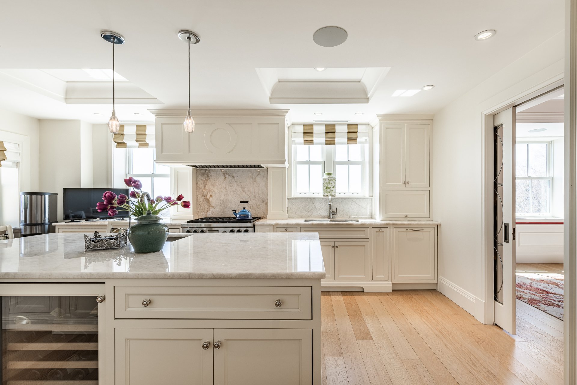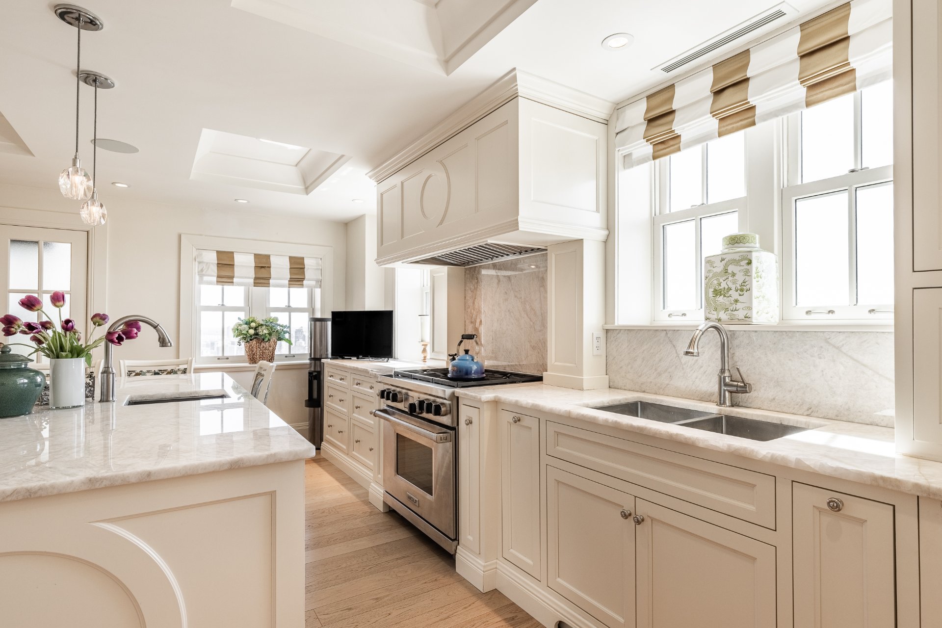 + Gourmet kitchen with oversized island, marble countertops, custom cabinetry, and top-tier appliances