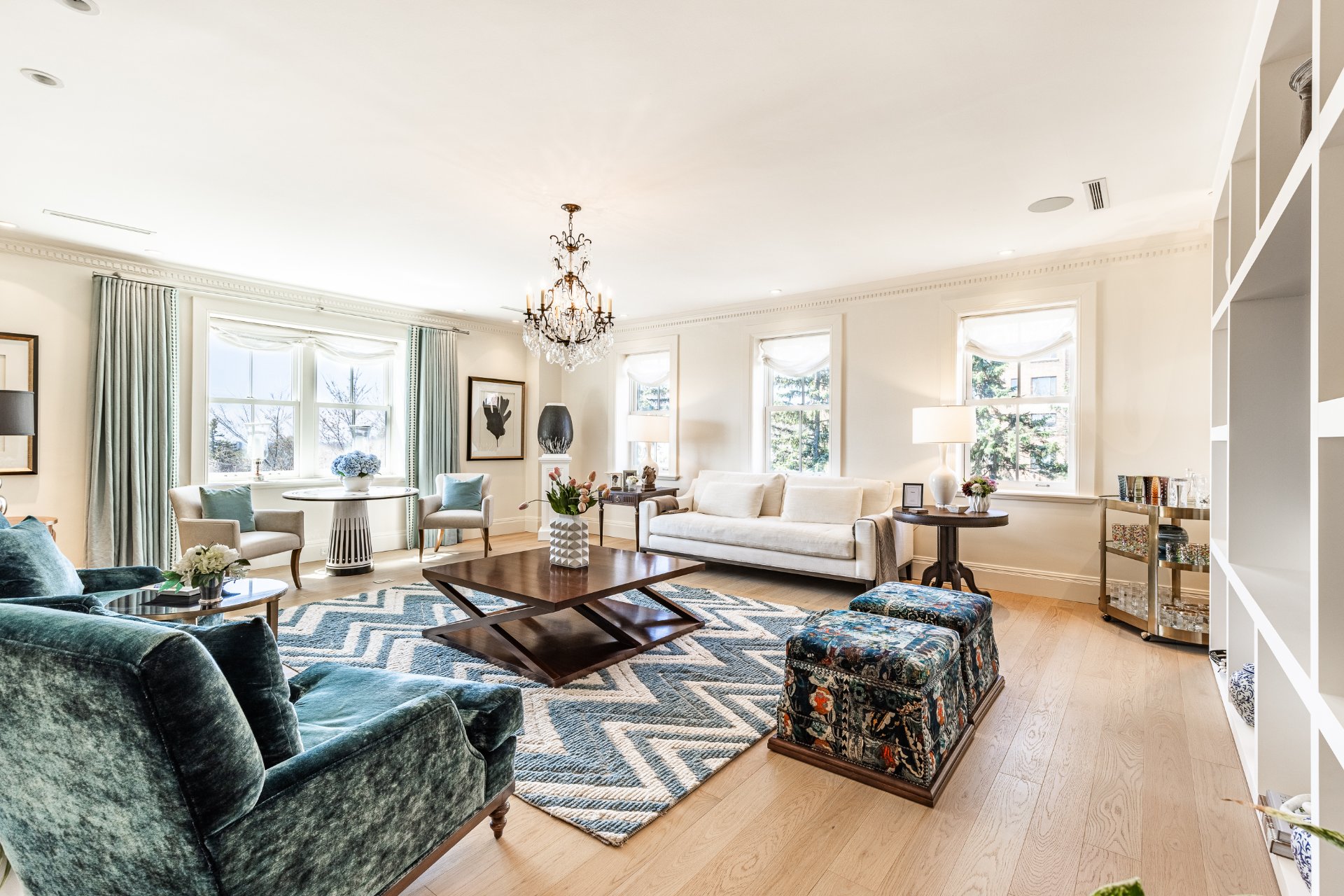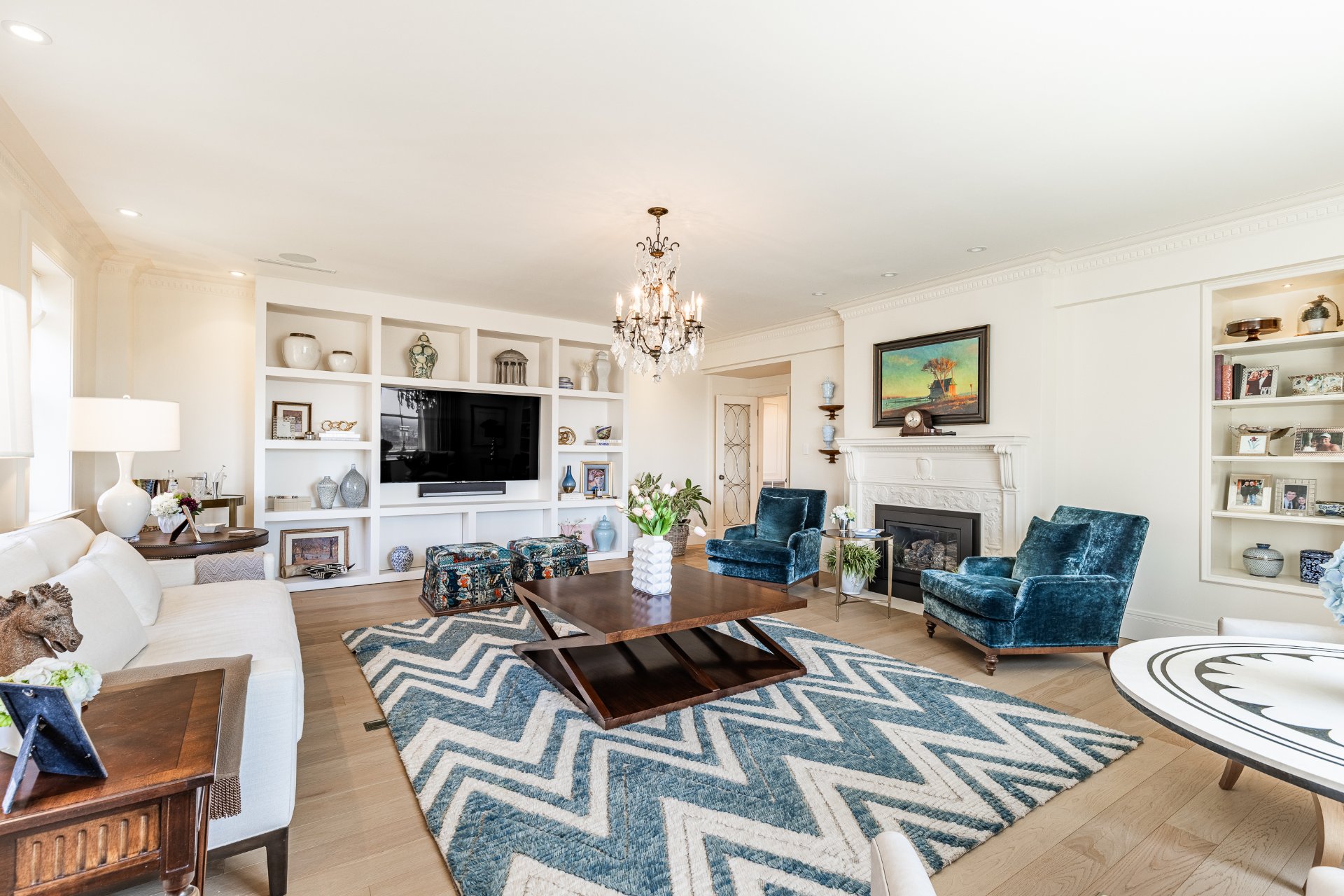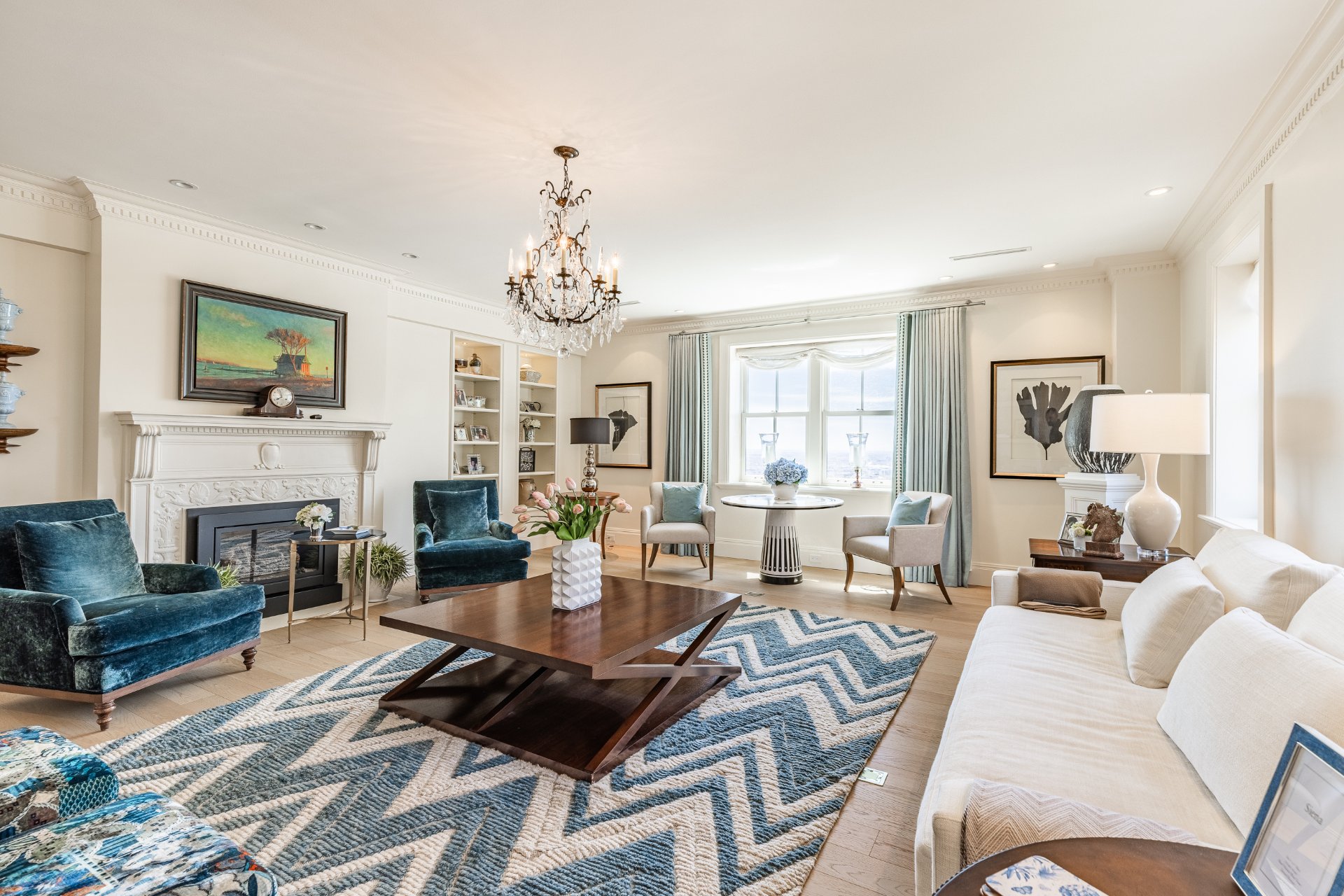 + Expansive formal living room with classic architectural details, gas fireplace, built-ins, and abundant natural light