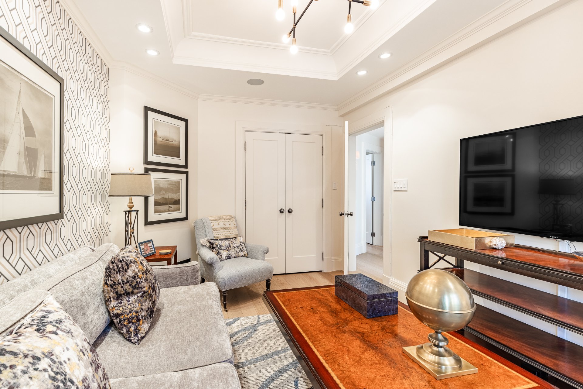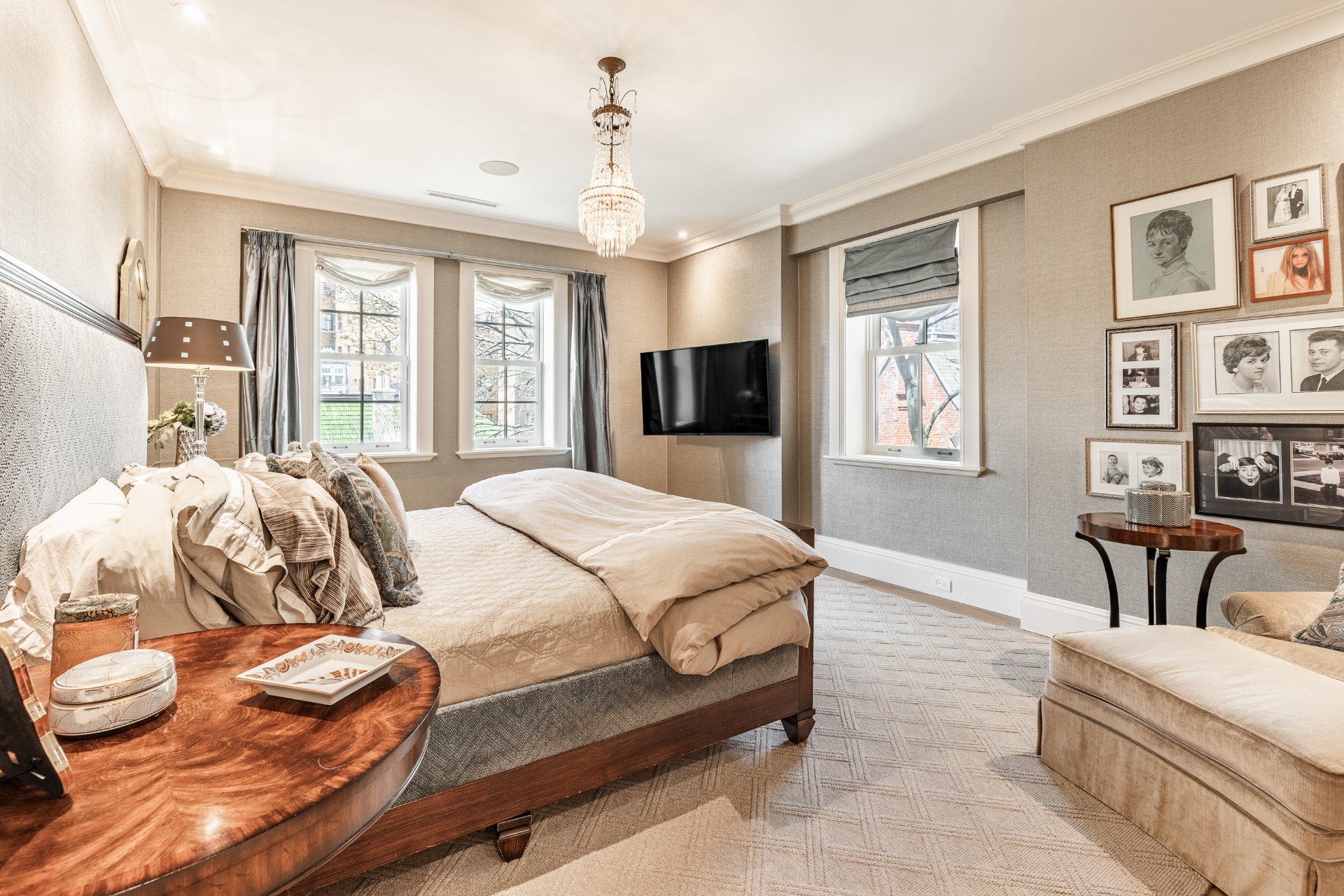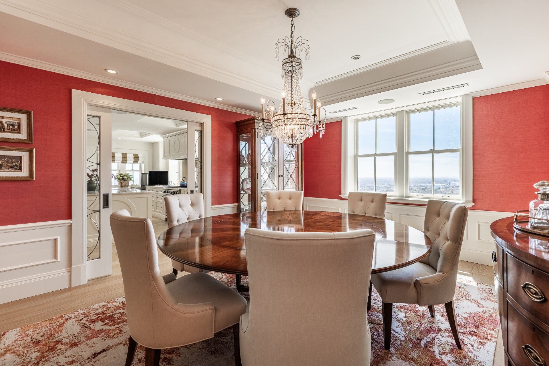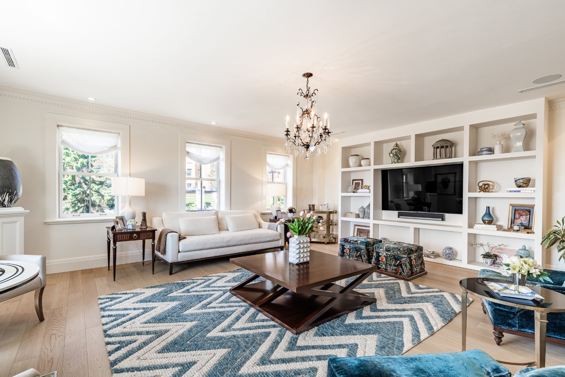 + Expansive formal living room with classic architectural details, gas fireplace, built-ins, and abundant natural light