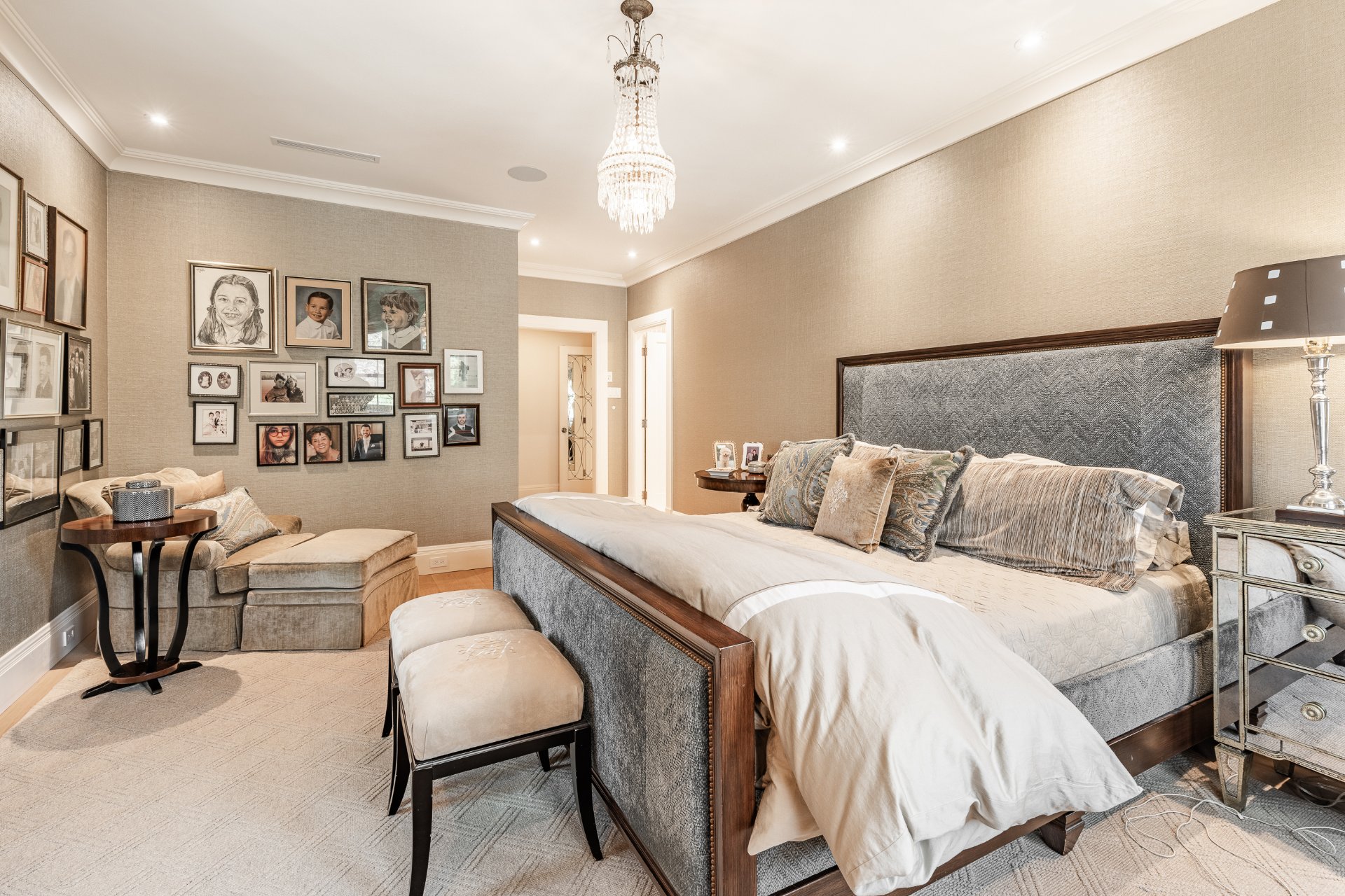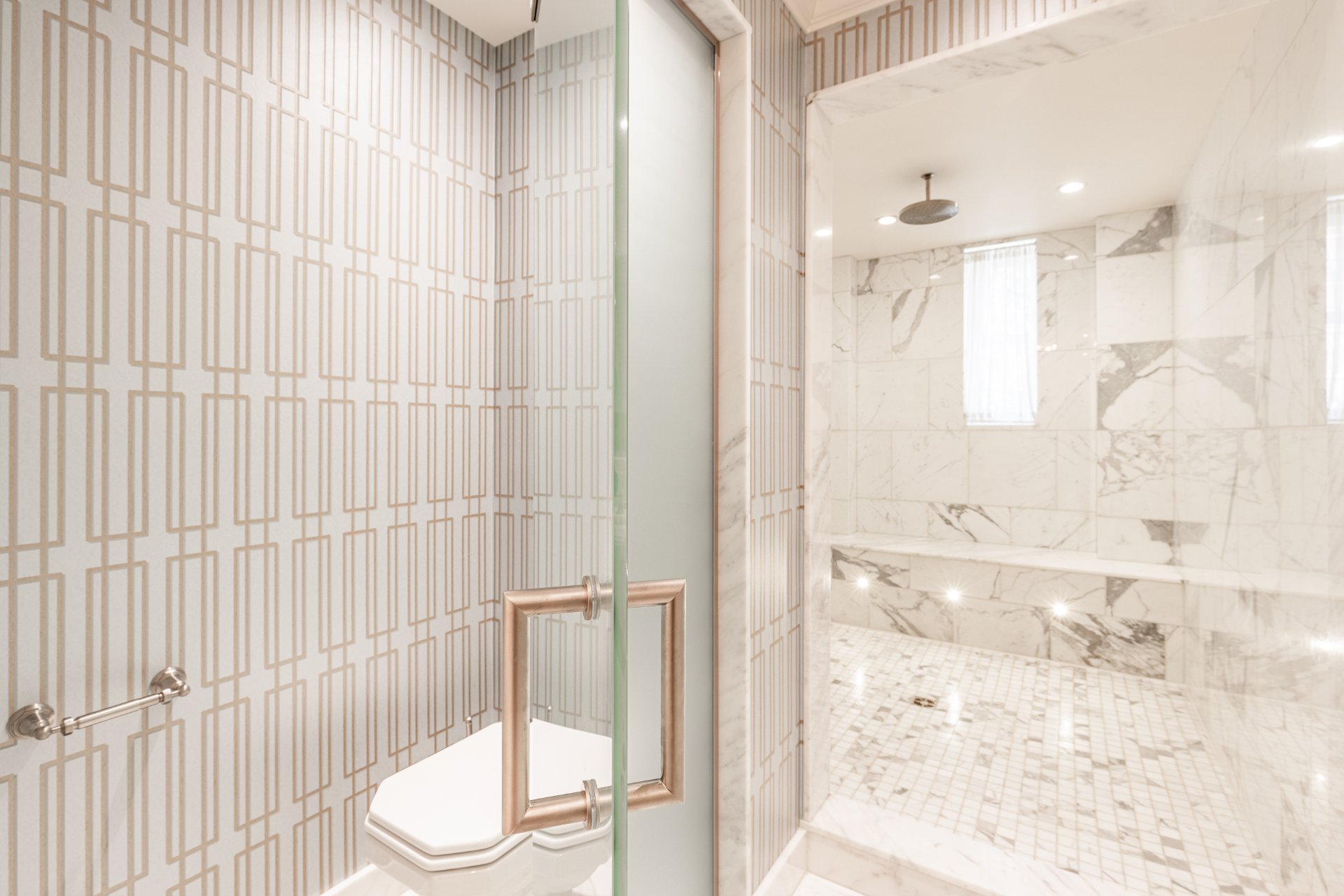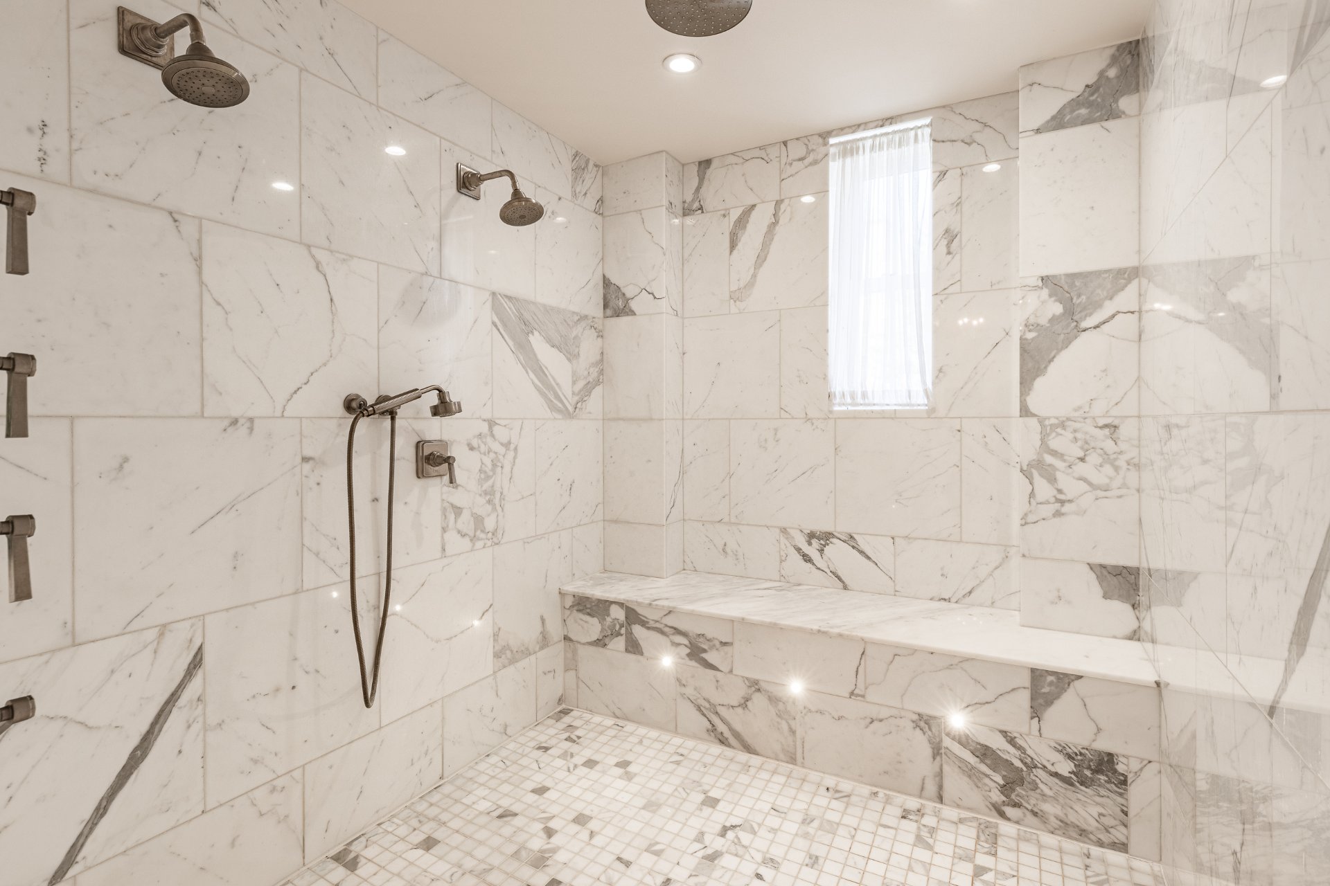 + Massive master suite featuring custom walk-in closet and a luxurious marble ensuite with double vanity, makeup area, oversized steam shower with multiple heads, and heated floor.