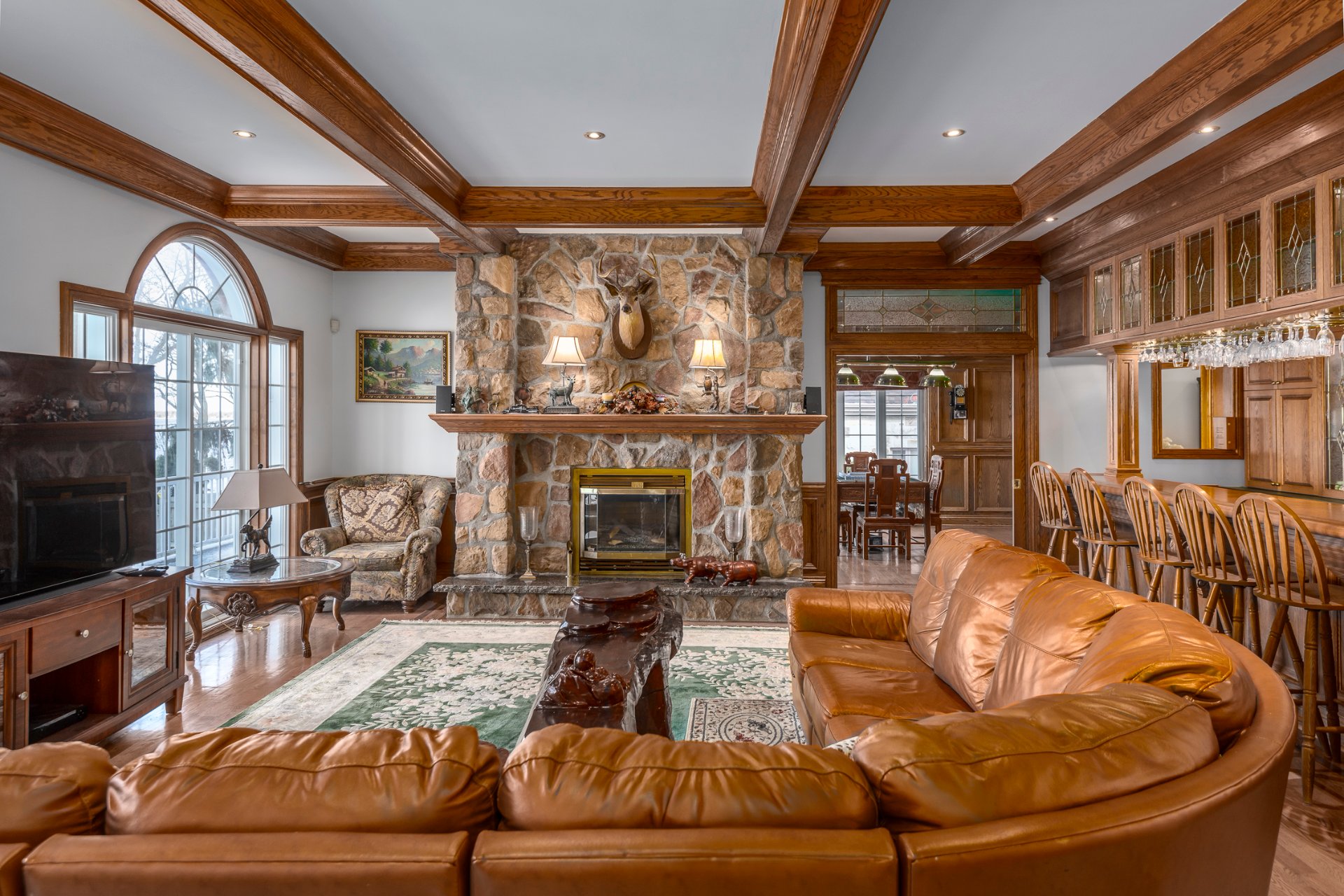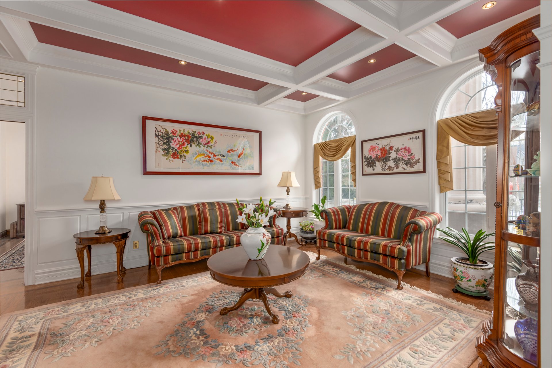 + A sophisticated living room with elegant coffered ceilings provides the perfect setting for receiving guests.