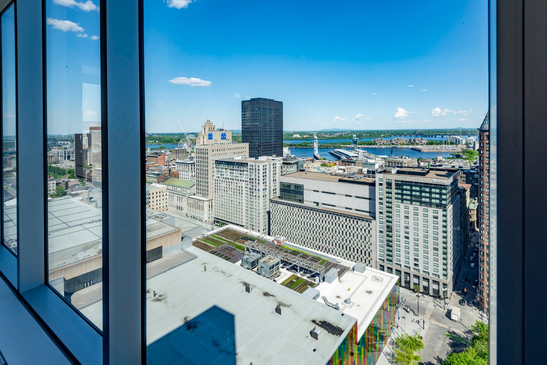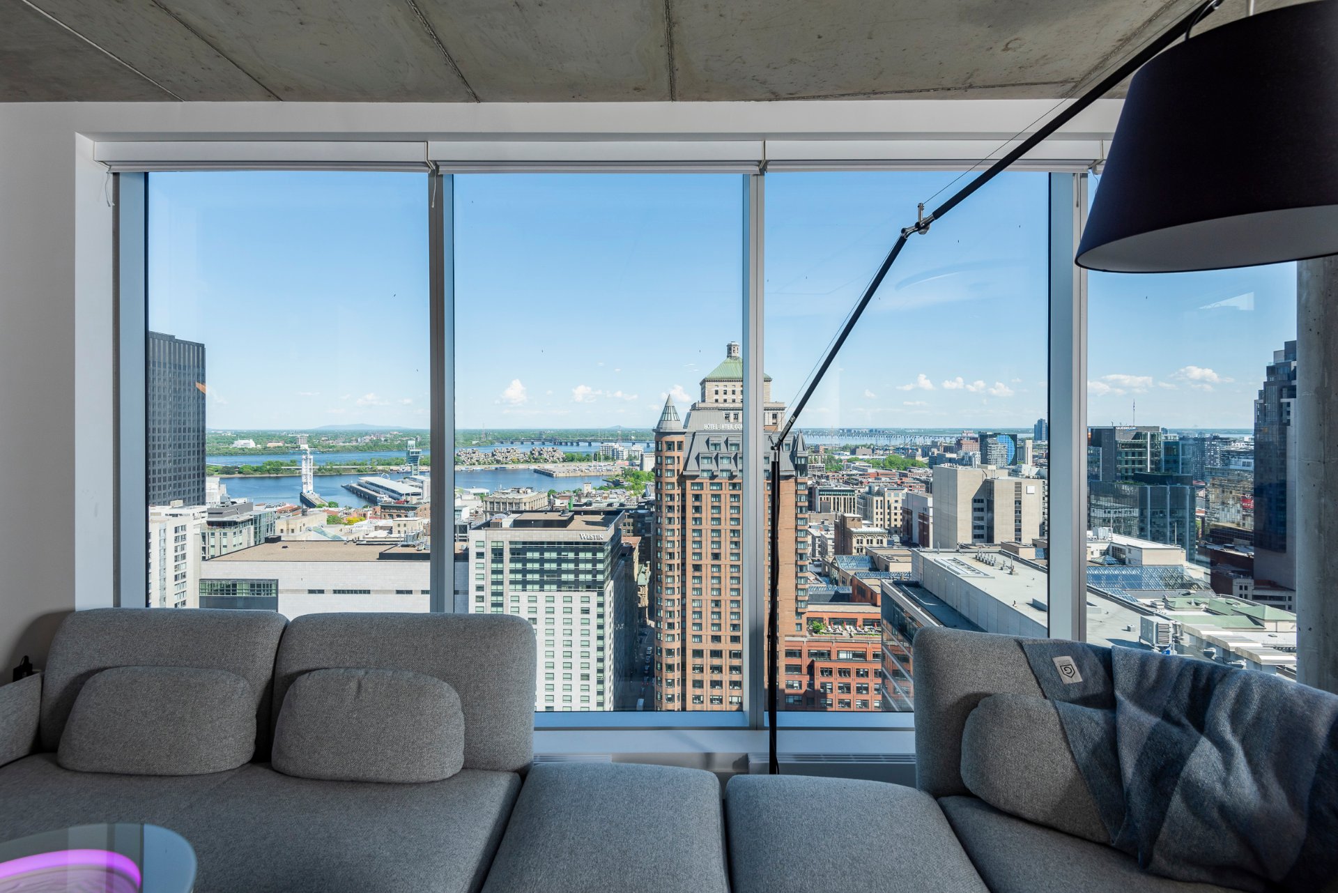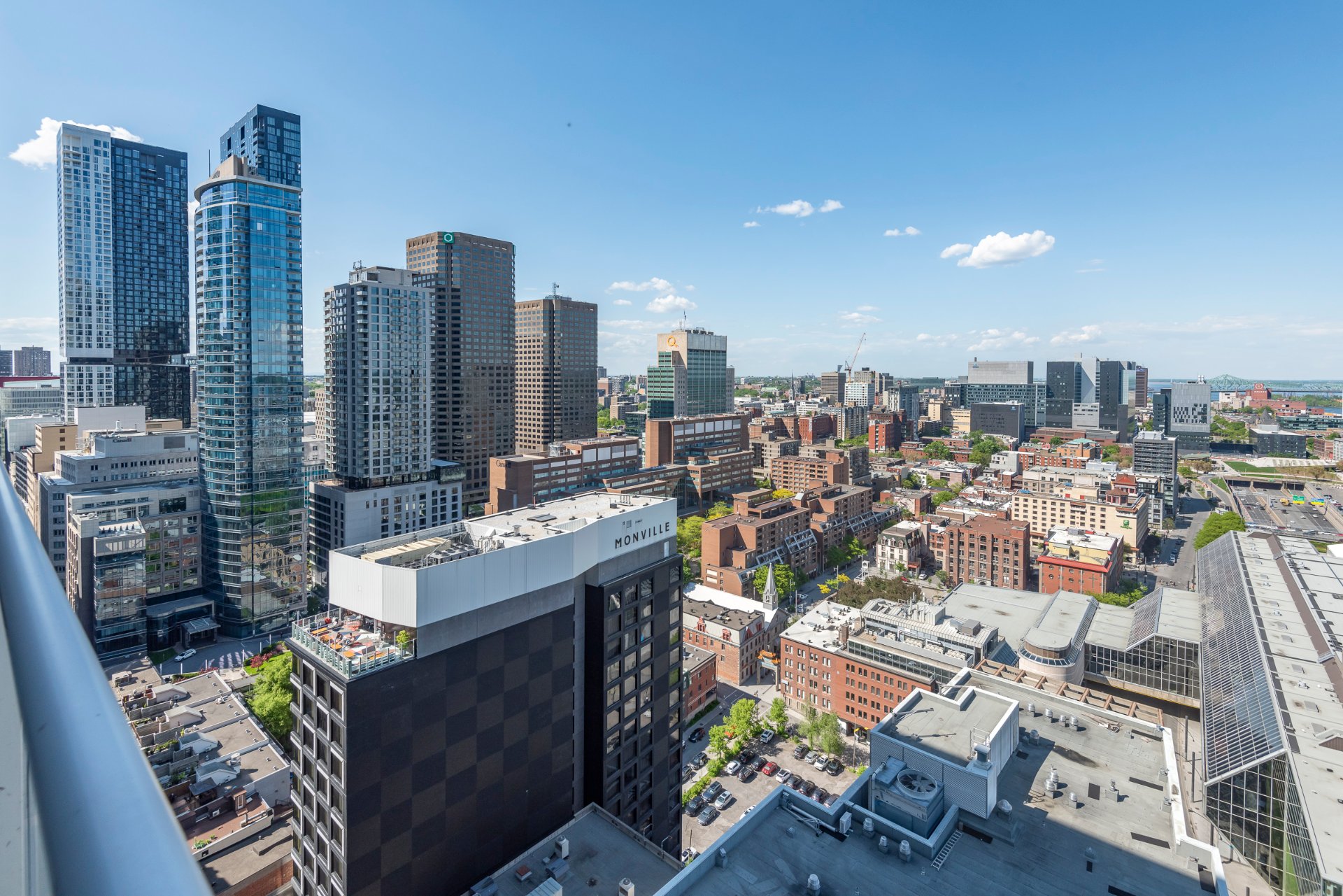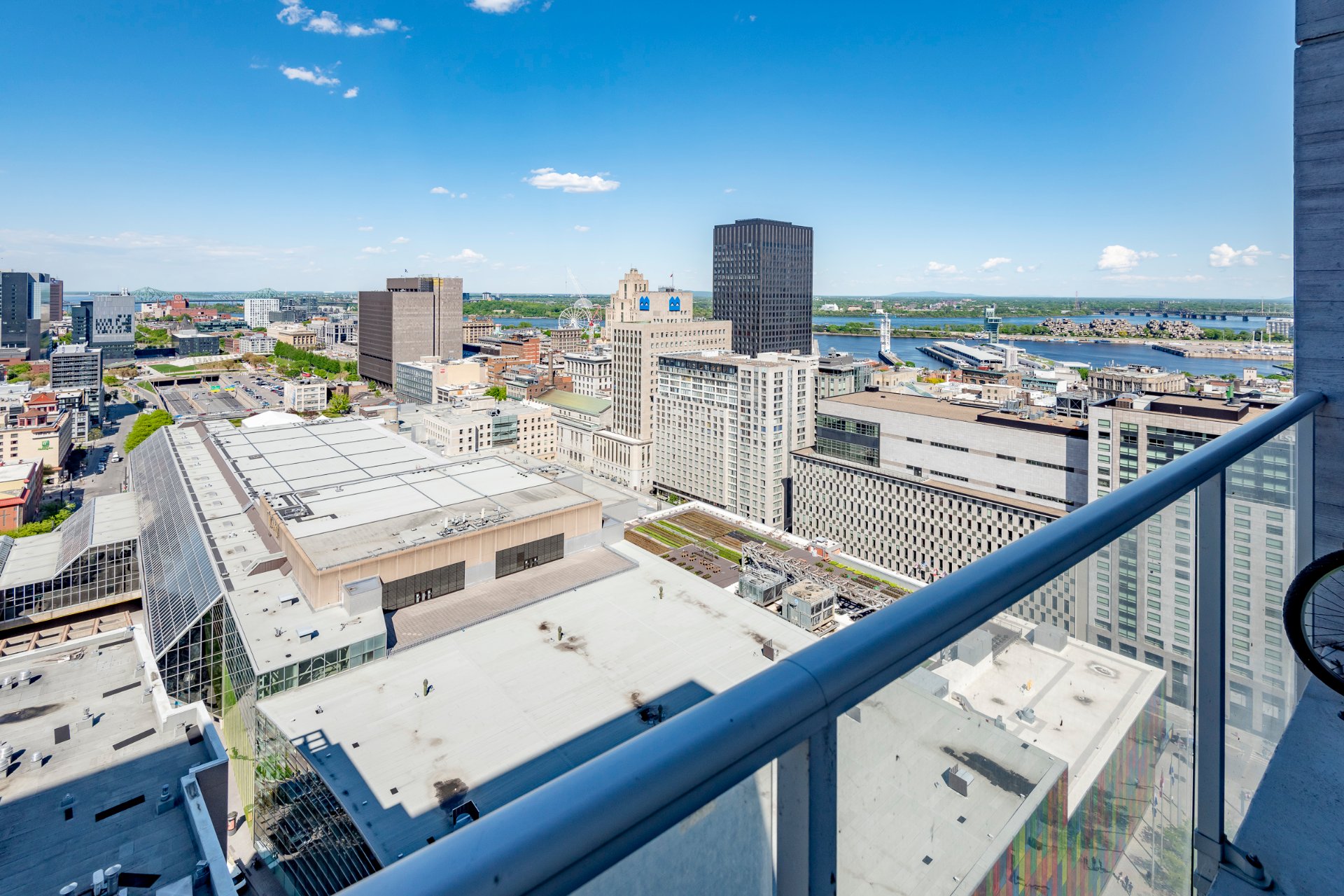 On the 29th floor of Humaniti, a prestigious high-rise building, this spectacular corner apartment offers breathtaking panoramic views of the river, the city, and Mount St. Hilaire — a permanent vista you’ll never tire of. Summer brings dazzling fireworks displays, an absolute delight to watch. The spacious, open-concept layout is perfect for both family gatherings and entertaining guests. This exceptional property features two beautiful bedrooms, a home office, two full bathrooms, two large balconies, and two garage parking spaces.