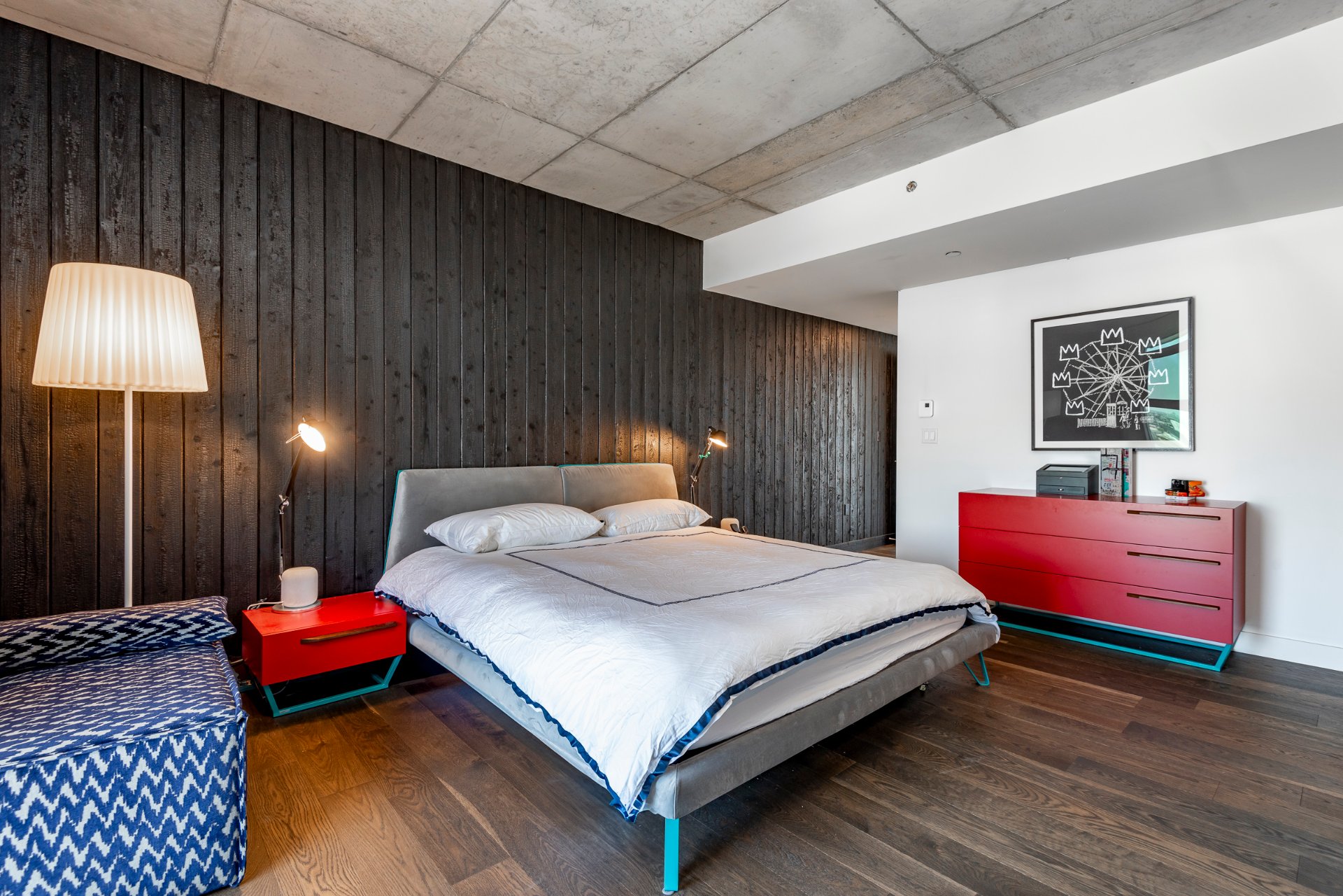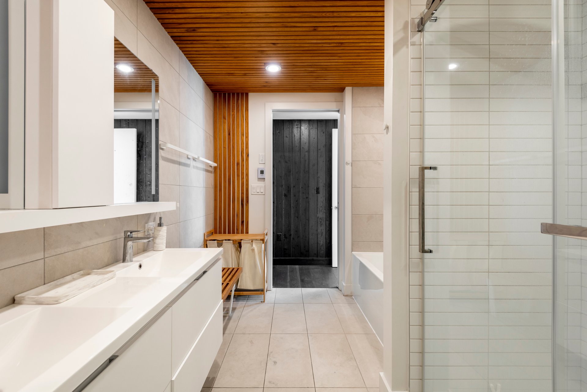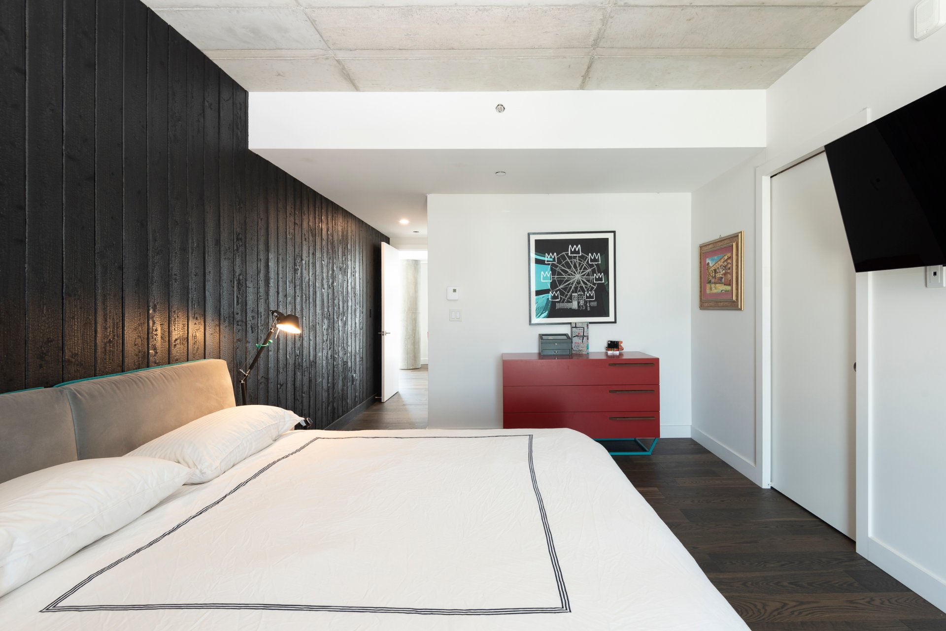 + Spacious master suite with east exposure, featuring a striking Japanese burnt wood accent wall, a walk-in closet, and a Scandinavian-inspired ensuite bathroom.