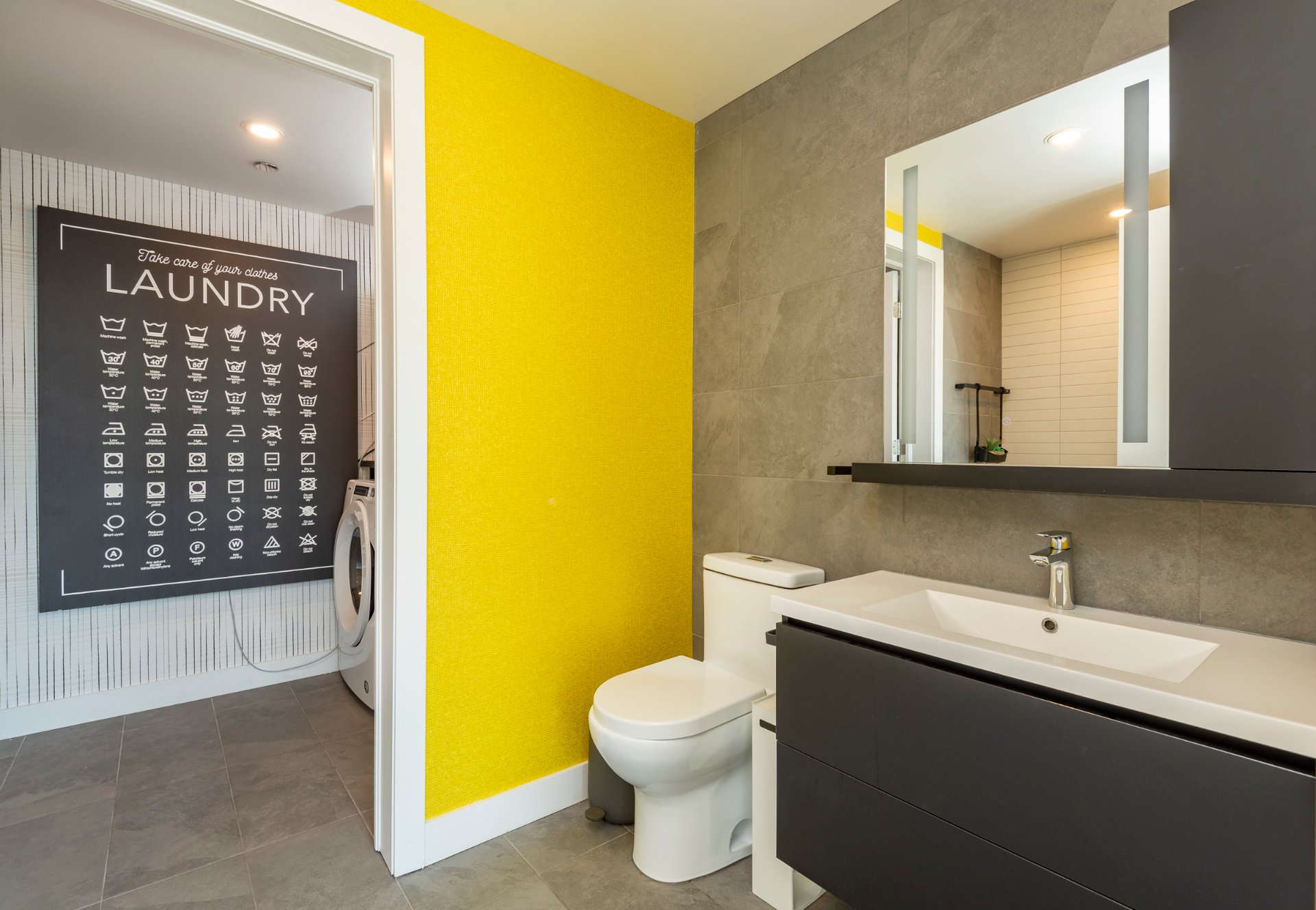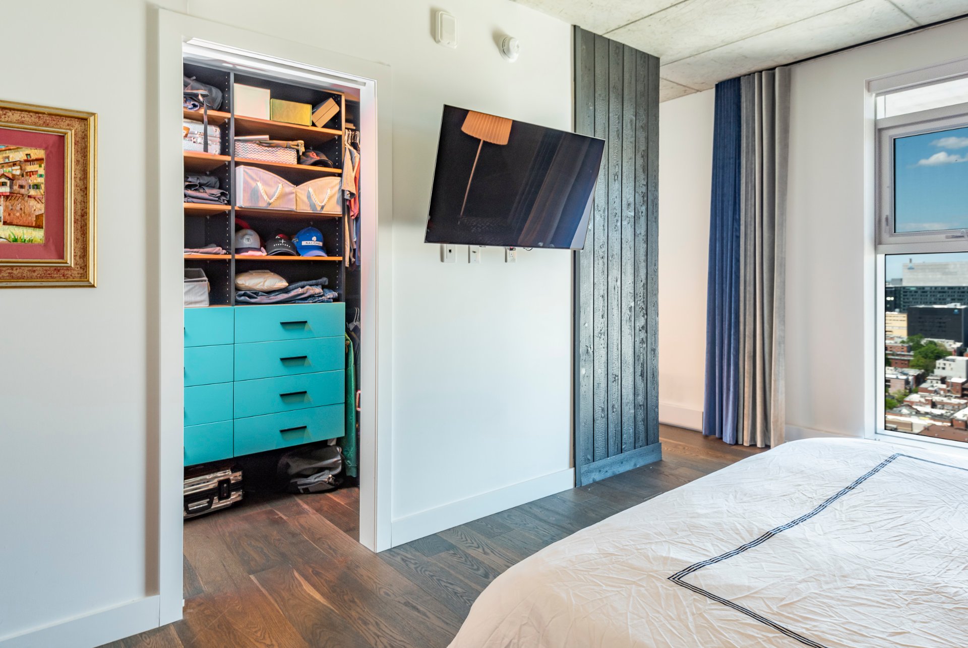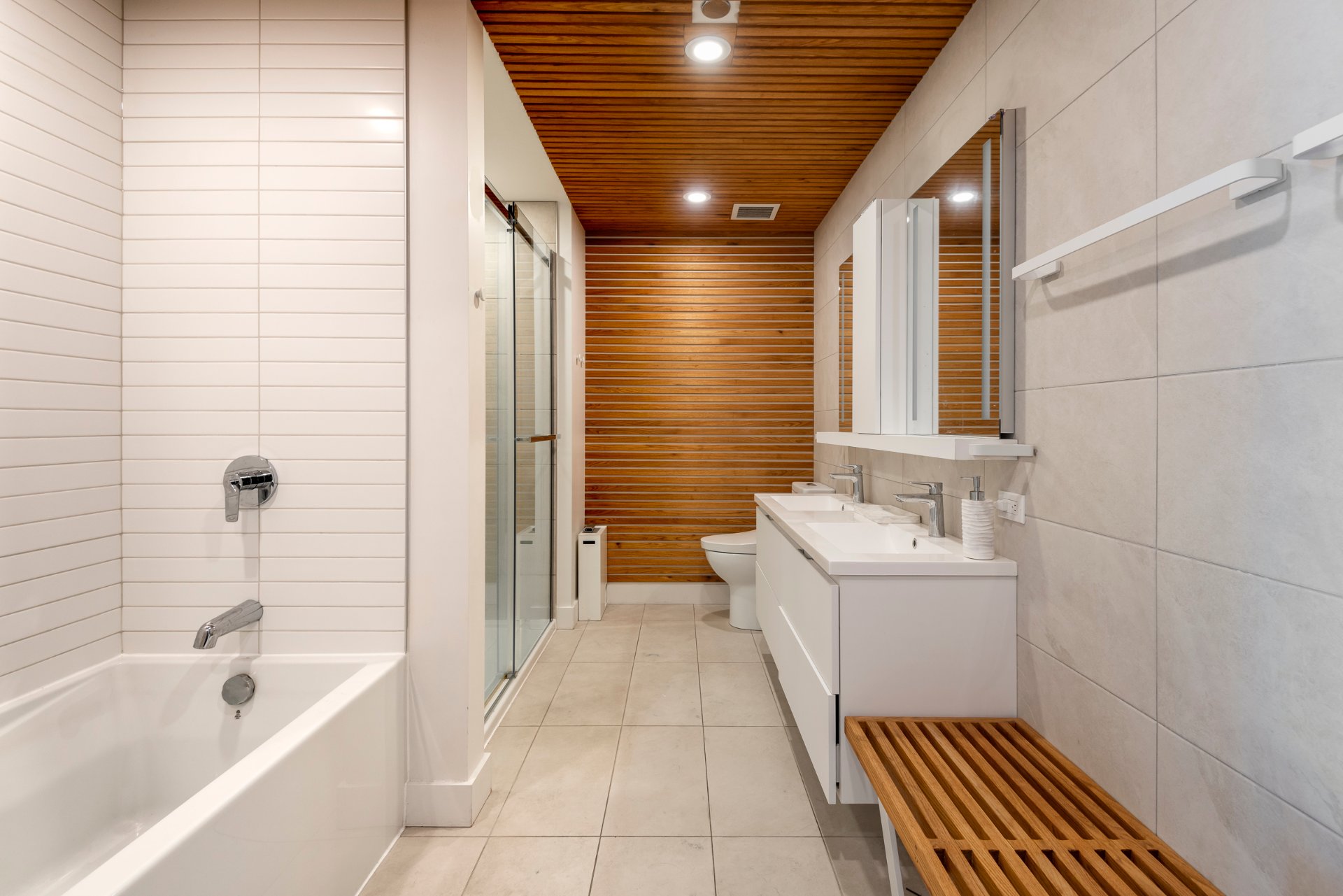 + Spacious master suite with east exposure, featuring a striking Japanese burnt wood accent wall, a walk-in closet, and a Scandinavian-inspired ensuite bathroom.