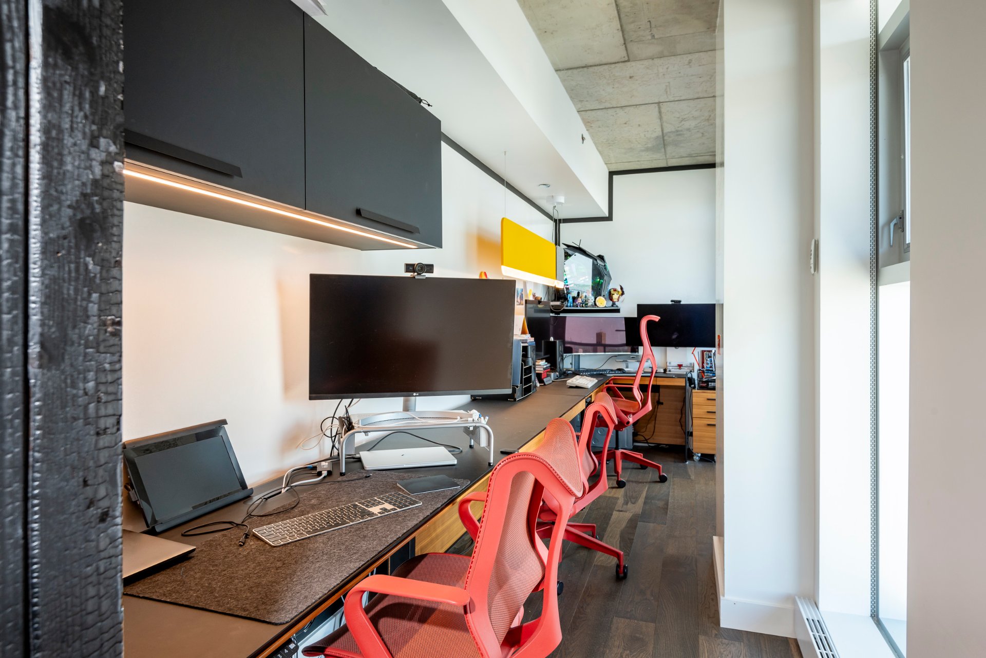 + An adjacent office space offers a dedicated desk area and whiteboards-painted walls, ideal for creatives and remote professionals.