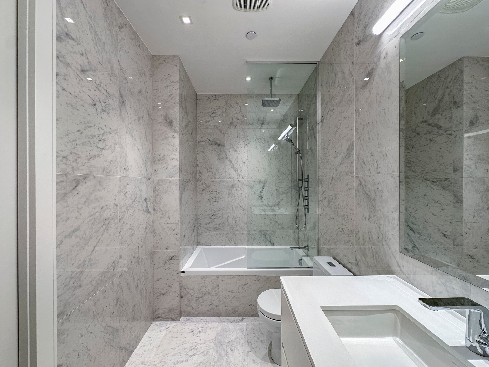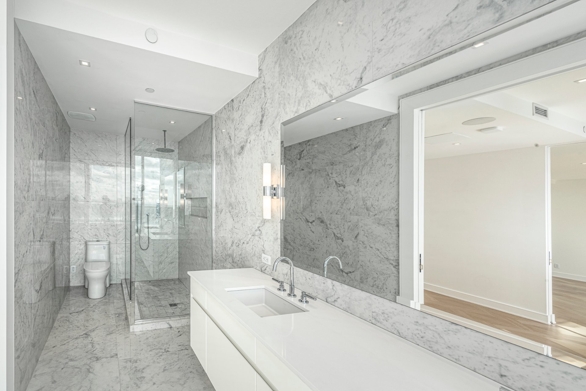+ Massive master suite with walk-in closet and marble ensuite featuring an oversized shower, heated floors.