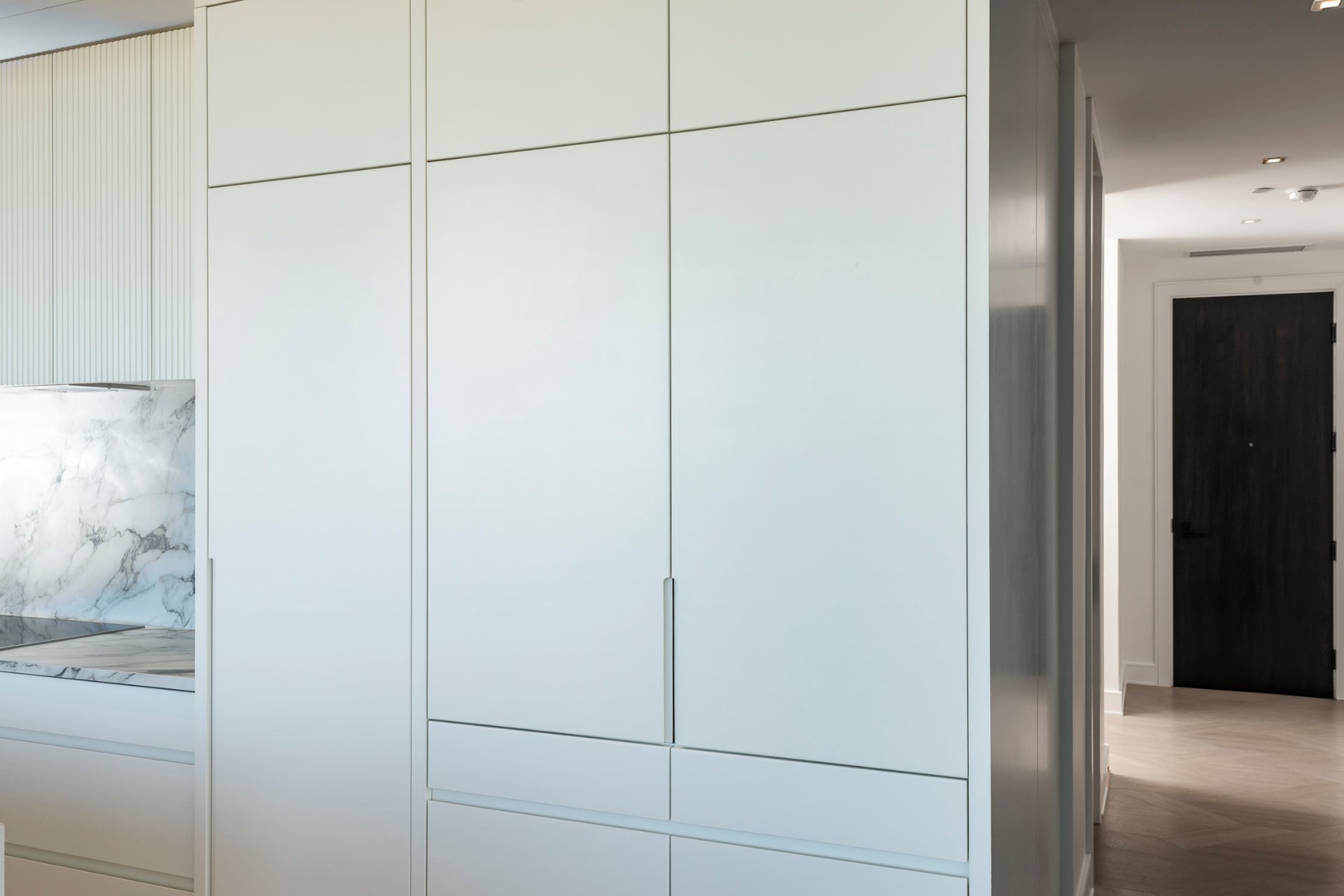 + Gourmet marble kitchen with high-end appliances and abundant storage.