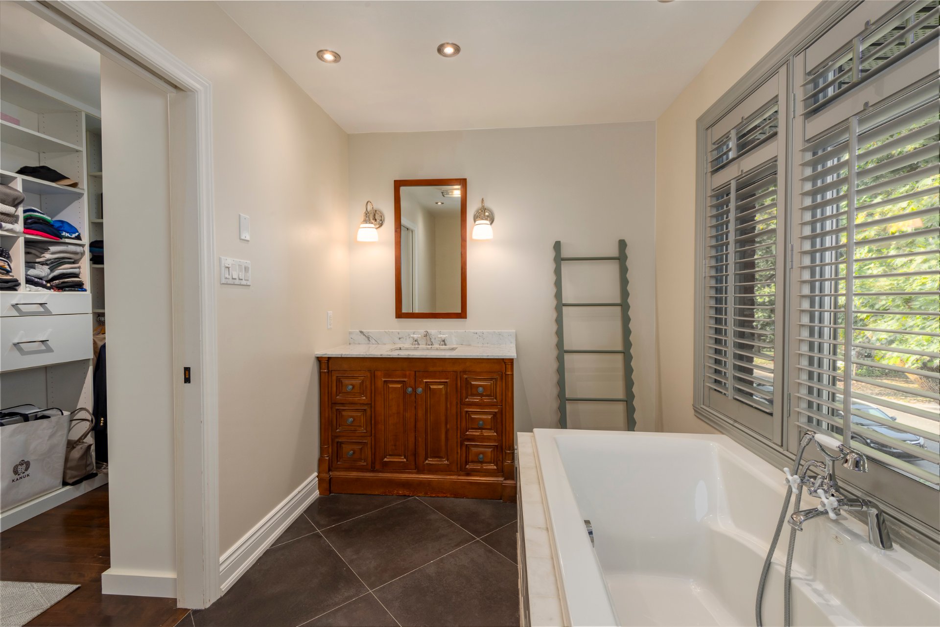 + The upper floor is divided into two wings: Children's wing: two spacious bedrooms each with a walk-in closet Adult wing: 4th bedroom and primary suite with custom walk-in, elegant ensuite with vanity, shower, and tub; possibility to extend the suite toward the back of the home