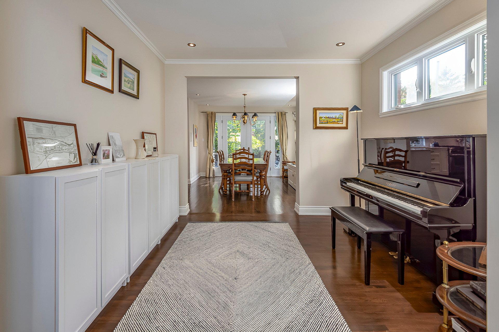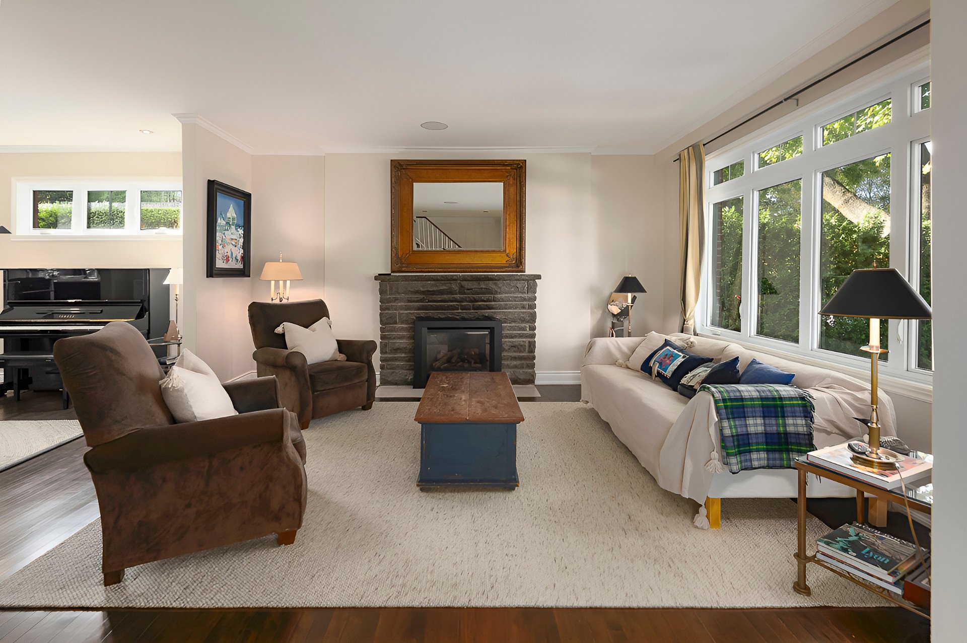 + Formal living room overlooking the quiet street, featuring a gas fireplace, seamlessly connected to an open office space.