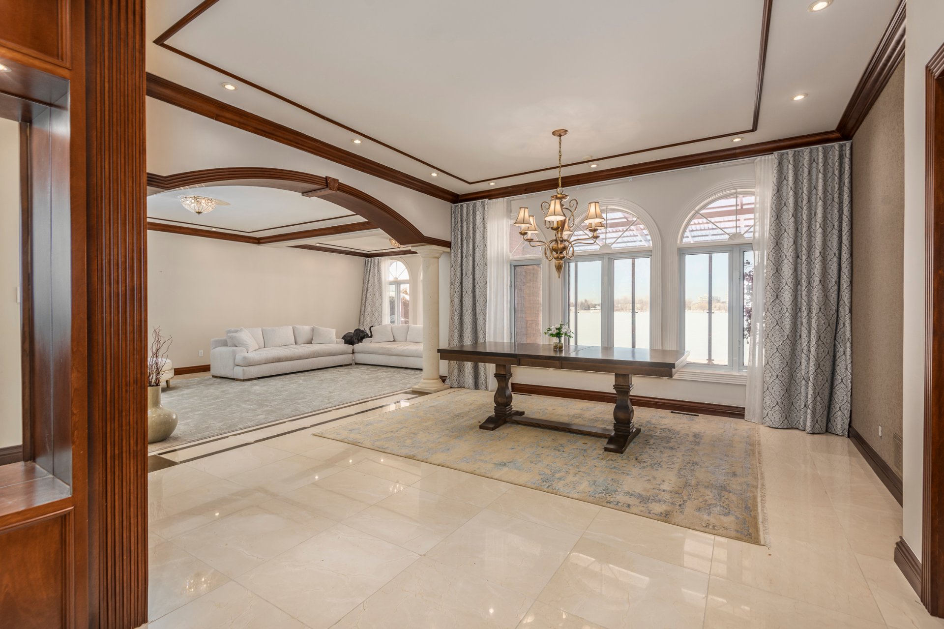 + The living room, featuring a gas fireplace, flows seamlessly into the dining room which enjoys pleasant views of the water.