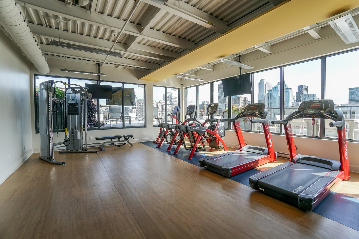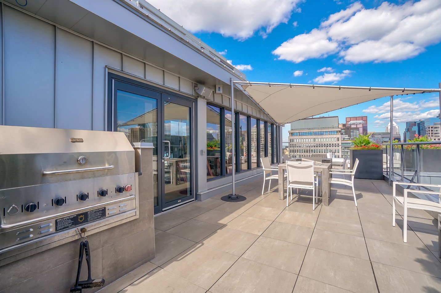 +The building offers doorman service, a fitness room and a rooftop terrace including barbecue.