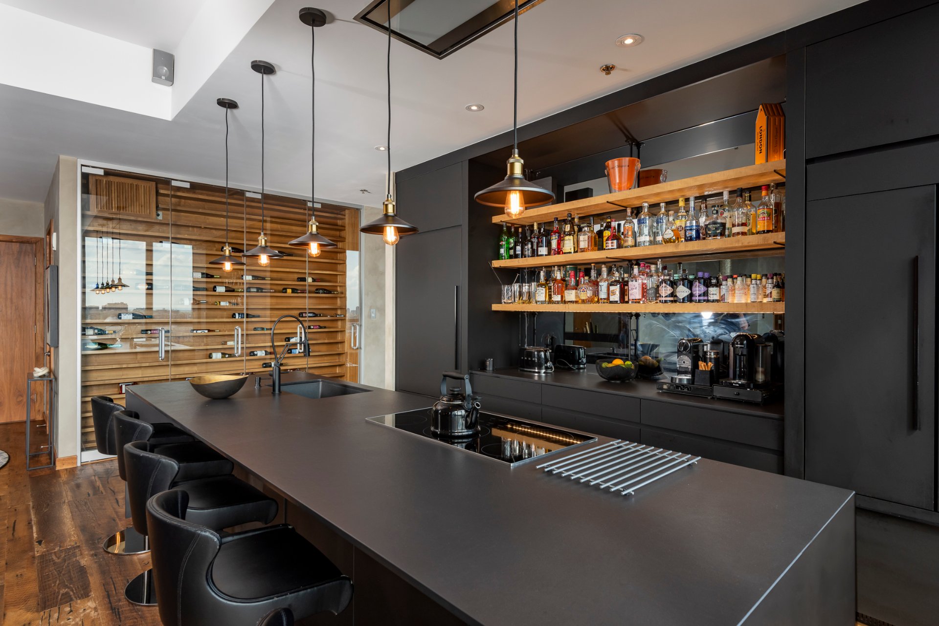 + Custom black kitchen with Dekton countertops, open-concept design ideal for entertaining