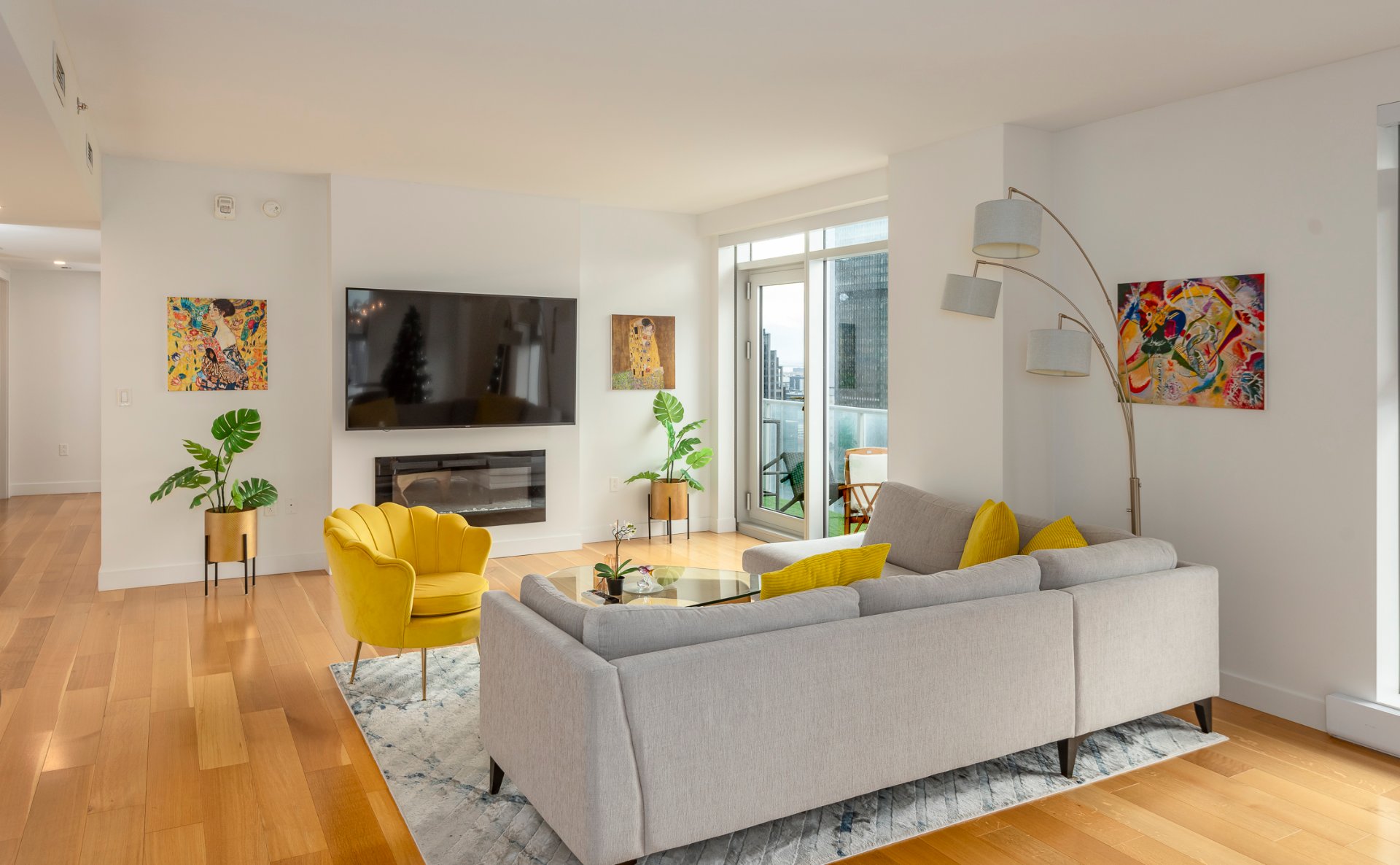 + Salon Confortable équipé d'un foyer électrique moderne et donnant accès à un balcon privé avec vue dégagée sur la ville.