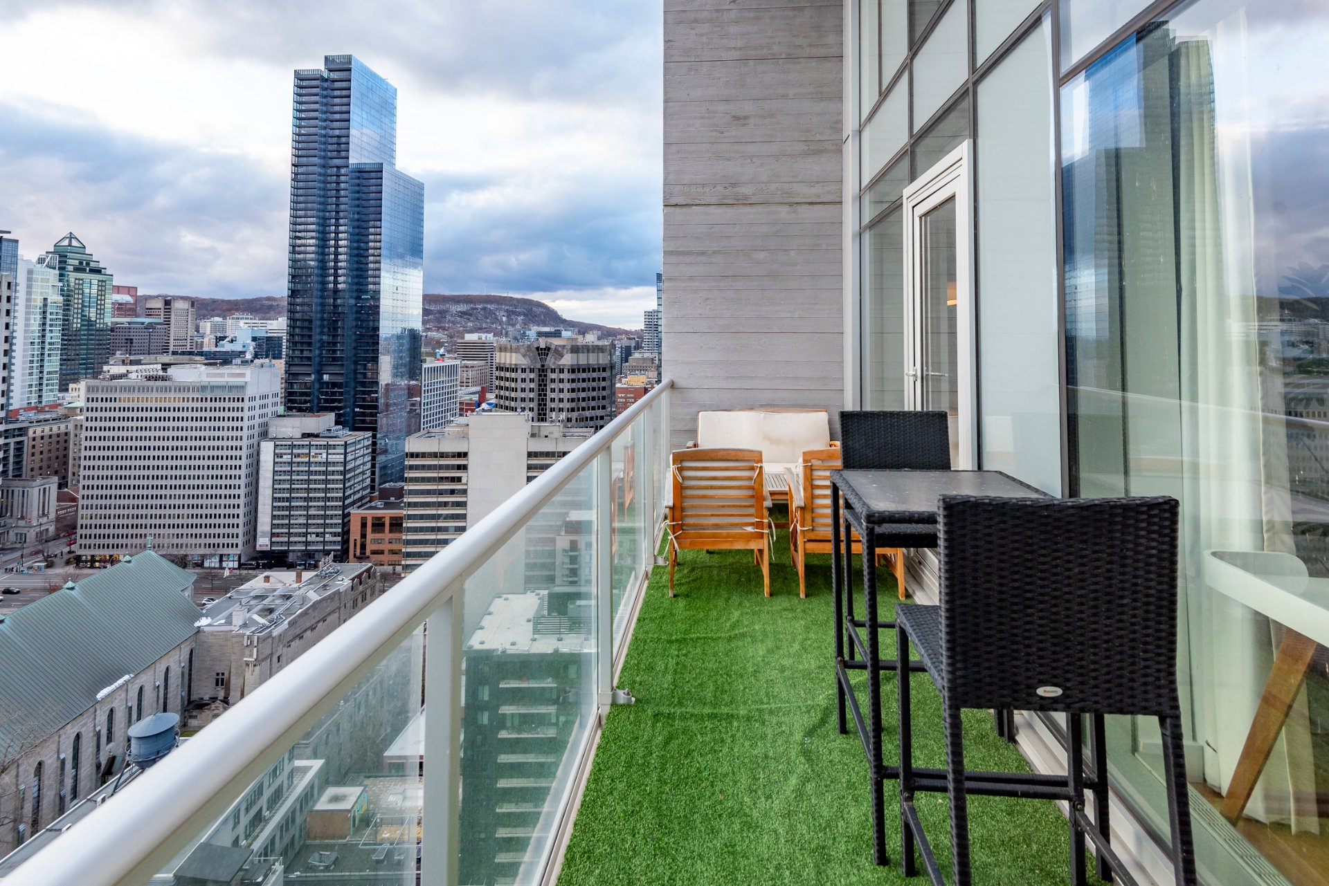 + Balcon avec une hauteur libre exceptionnelle de 18 pieds, sans rien au-dessus, permettant une sensation d'espace ouverte et aérée.
