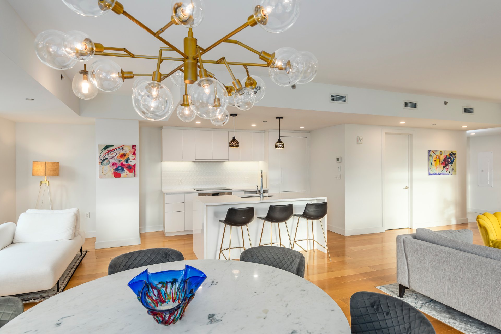 + Unité à aire ouverte spacieuse et contemporaine. L'espace de vie combine élégamment le salon, la salle à manger et la cuisine, idéal pour recevoir.