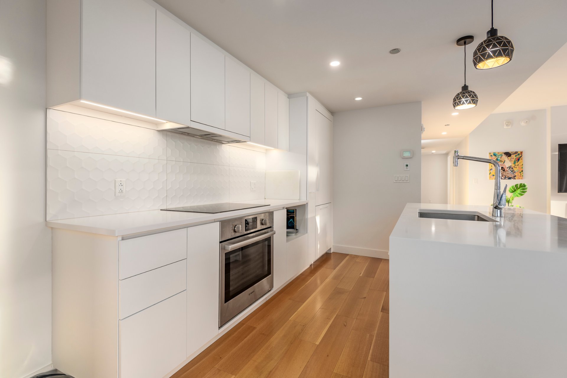 + Cuisine Haute-Gamme: Armoires blanches mattes au design épuré, avec un grand îlot central.